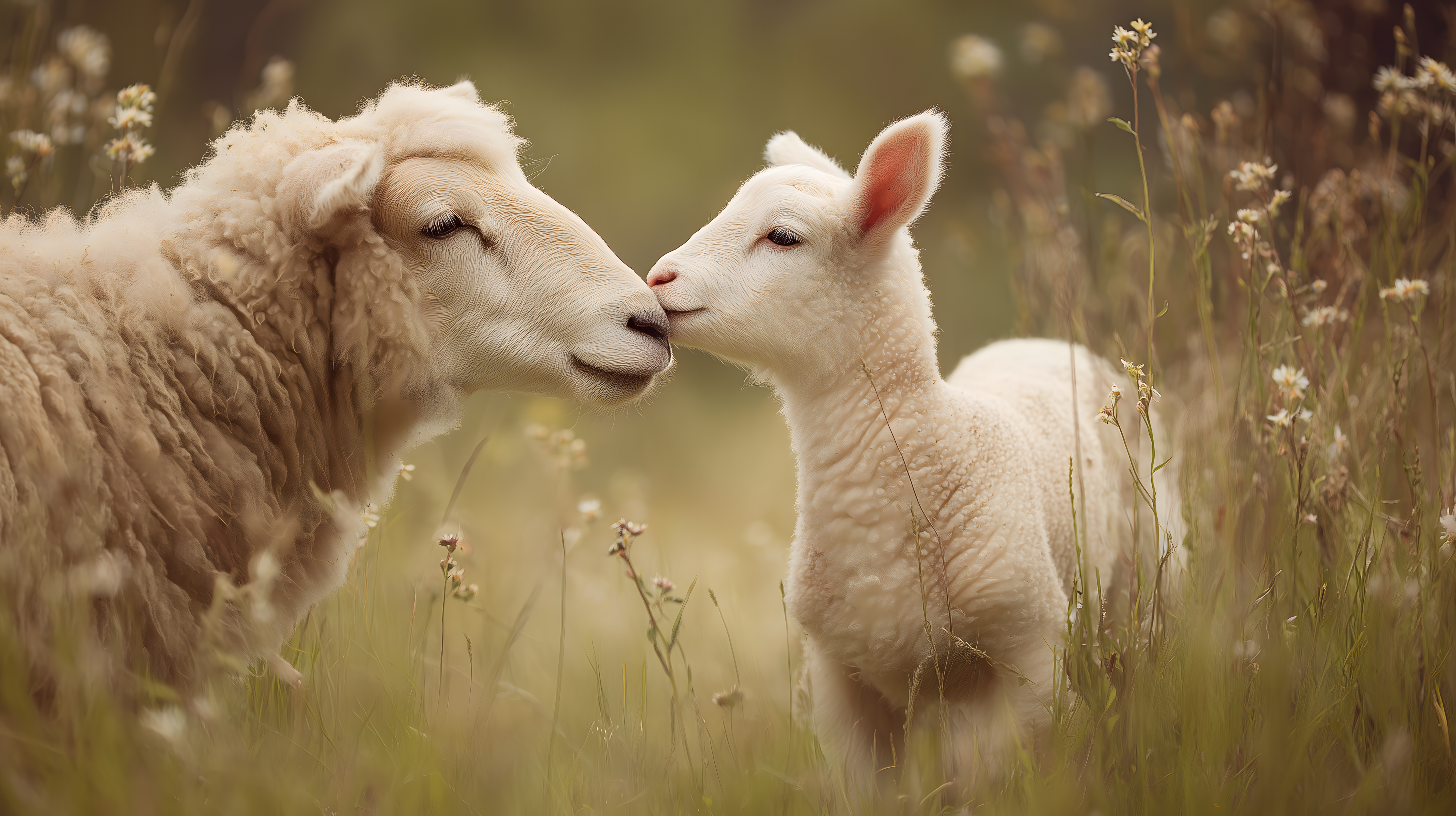 Das Bild zeigt zwei weiße, flauschige Lämmer, die sich liebevoll aneinander kuscheln und in einem sonnigen Wiesengras stehen. Die Aufnahme ist in warmen, pastelligen Farbtönen gehalten und vermittelt eine idyllische, ländliche Atmosphäre. Die zärtliche Szene zwischen Mutter und Kind lässt die Betrachter an Fürsorge und Zärtlichkeit in der Natur denken. Dieses stimmungsvolle Foto eignet sich hervorragend als hochwertiges Stockfoto für verschiedenste Anwendungen, wie Blogs, Social-Media-Beiträge, Werbekampagnen oder Newsletter rund um Themen wie Landwirtschaft, Tierwohl, Naturschutz oder Landleben. Das kostenlose Bild in hoher Auflösung steht unter einer Creative-Commons-Lizenz zur Verfügung.