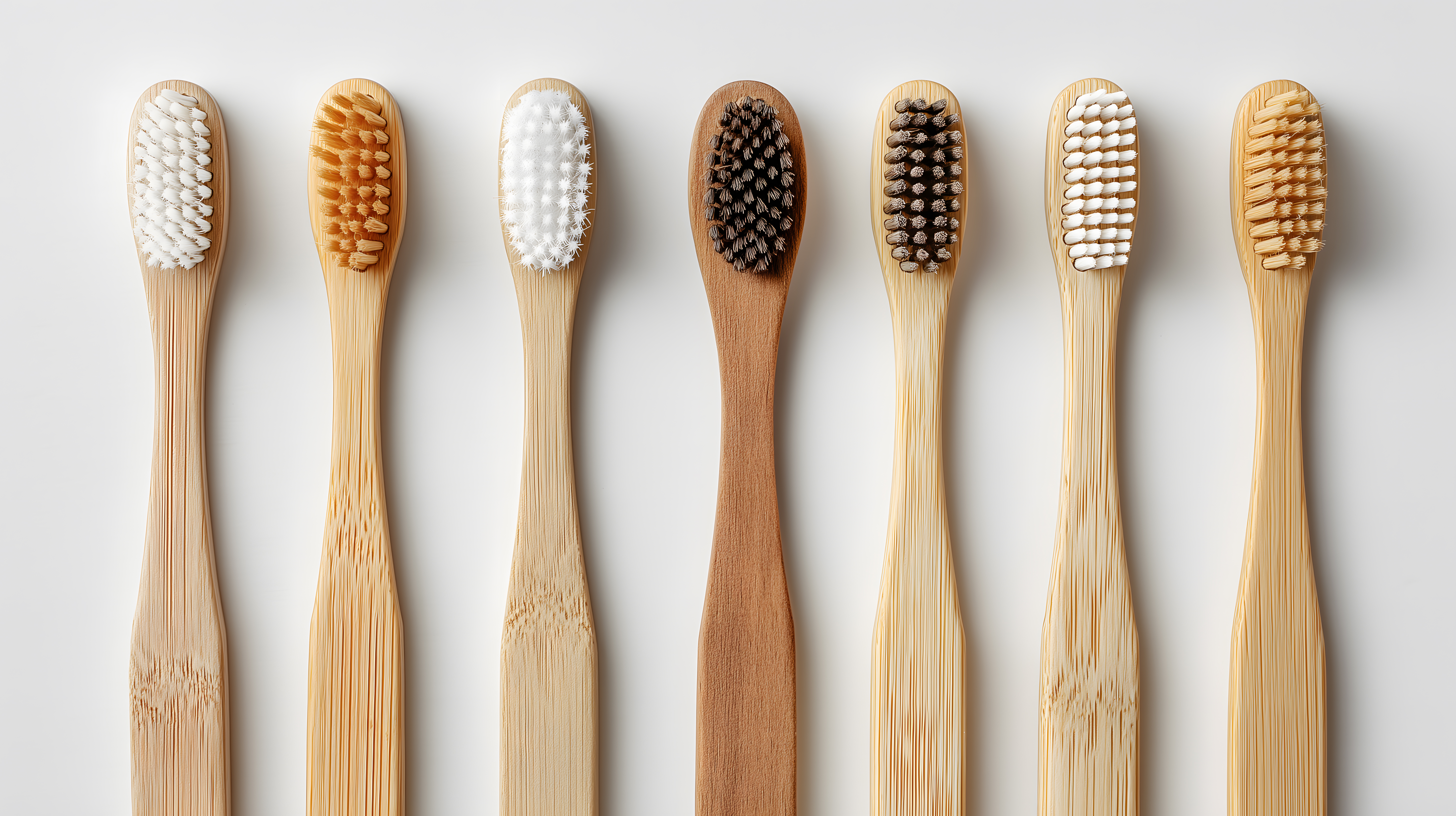 Dieses Bild zeigt eine Reihe von nachhaltigen Bambuszahnbürsten auf einem weißen Hintergrund. Die Zahnbürsten sind in verschiedenen natürlichen Farbtönen wie Weiß, Beige und Braun gehalten und präsentieren sich in einer minimalistischen und aufgeräumten Komposition. Dieses Stockfoto eignet sich hervorragend für den Einsatz in Blogs, Newslettern, Social-Media-Beiträgen oder Werbekampagnen rund um das Thema Nachhaltigkeit, Zahnpflege und gesundheitsbewusstes Lifestyle-Design. Das hochauflösende Bild steht unter der Creative-Commons-Lizenz zur kostenlosen Nutzung zur Verfügung.
