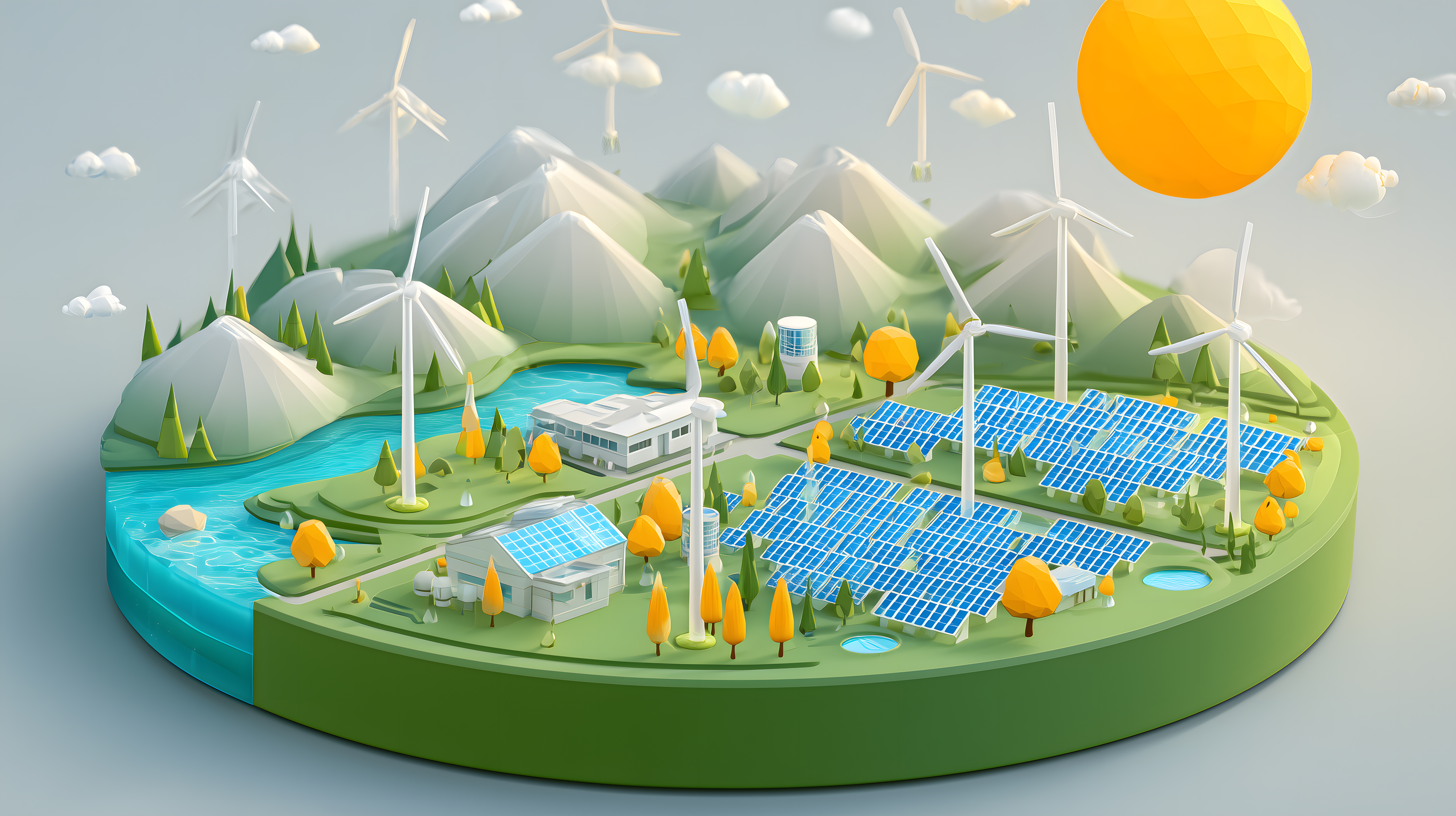 Dieses stimmungsvolle Bild zeigt eine idyllische Berglandschaft mit Windrädern und Solarpaneelen, die eine nachhaltige Energiewende symbolisieren. In der isometrischen 3D-Darstellung erkennt man einen See, Wälder, schneebedeckte Berge und einen strahlenden Himmel mit Wolken. Die Windräder und Solarpaneele sind in die Landschaft eingebunden und erzeugen erneuerbare Energie. Dieses hochauflösende Stockfoto eignet sich perfekt für Blogbeiträge, Newsletter oder Social-Media-Posts zum Thema Umweltschutz, Nachhaltigkeit und den Einsatz von Öko-Energie. Das Bild ist unter einer Creative-Commons-Lizenz frei verwendbar.