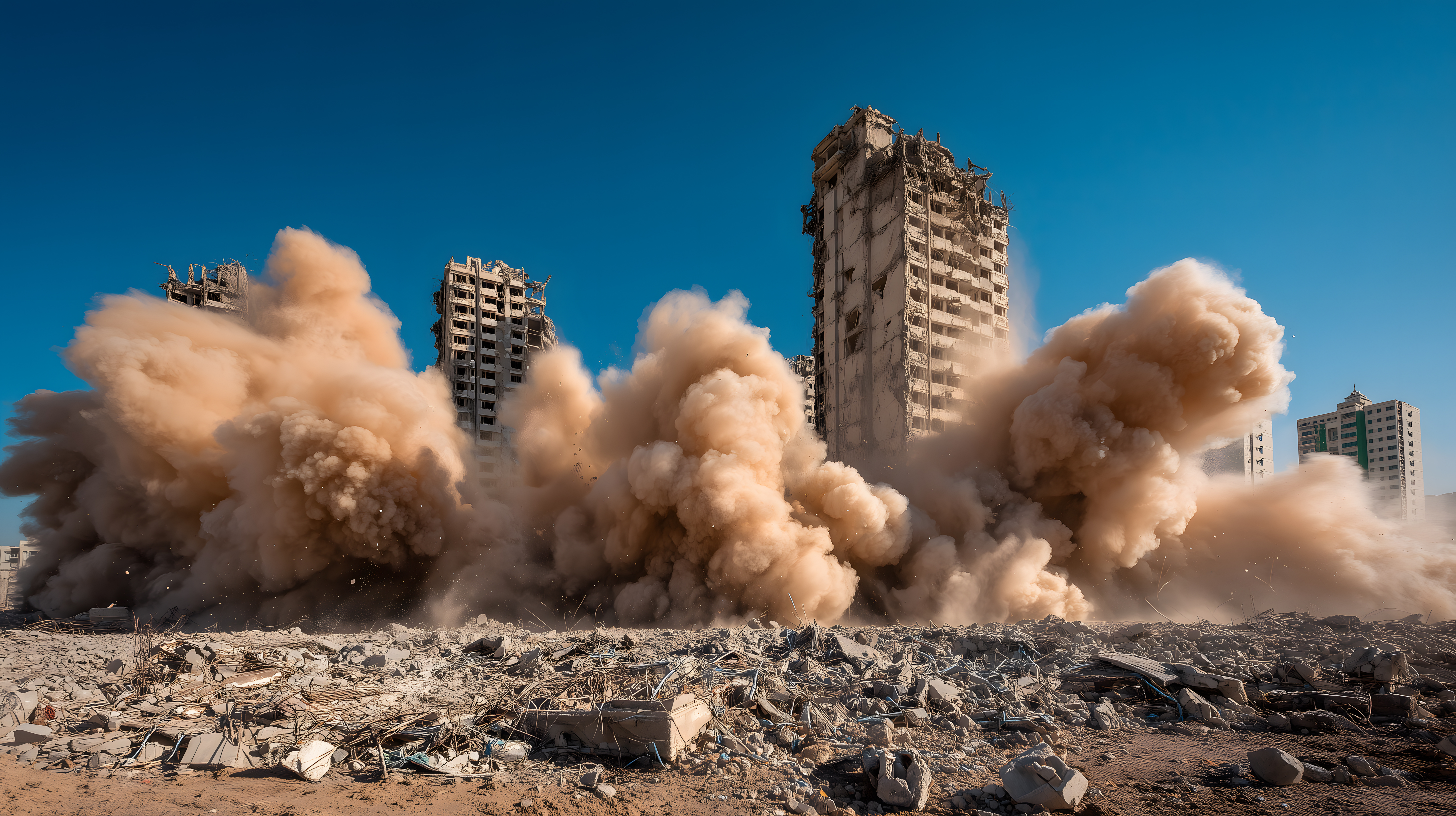 Das Foto zeigt die gewaltige Sprengung und den anschließenden Einsturz eines Hochhauses, was in einer gigantischen Staubwolke resultiert. Die Fassade des Gebäudes ist bereits komplett zerstört und die Trümmerteile liegen verstreut am Boden. Die umliegenden Hochhäuser sind im Hintergrund zu sehen, wodurch das enorme Ausmaß der Demolierungsaktion deutlich wird. Dieses eindrucksvolle Bild könnte beispielsweise in Artikeln über Stadtplanung, Architektur oder Baustellenunfälle verwendet werden. Es ist ein hochauflösendes, kostenloses Stockfoto unter der Creative-Commons-Lizenz, das für private sowie kommerzielle Zwecke genutzt werden kann.
