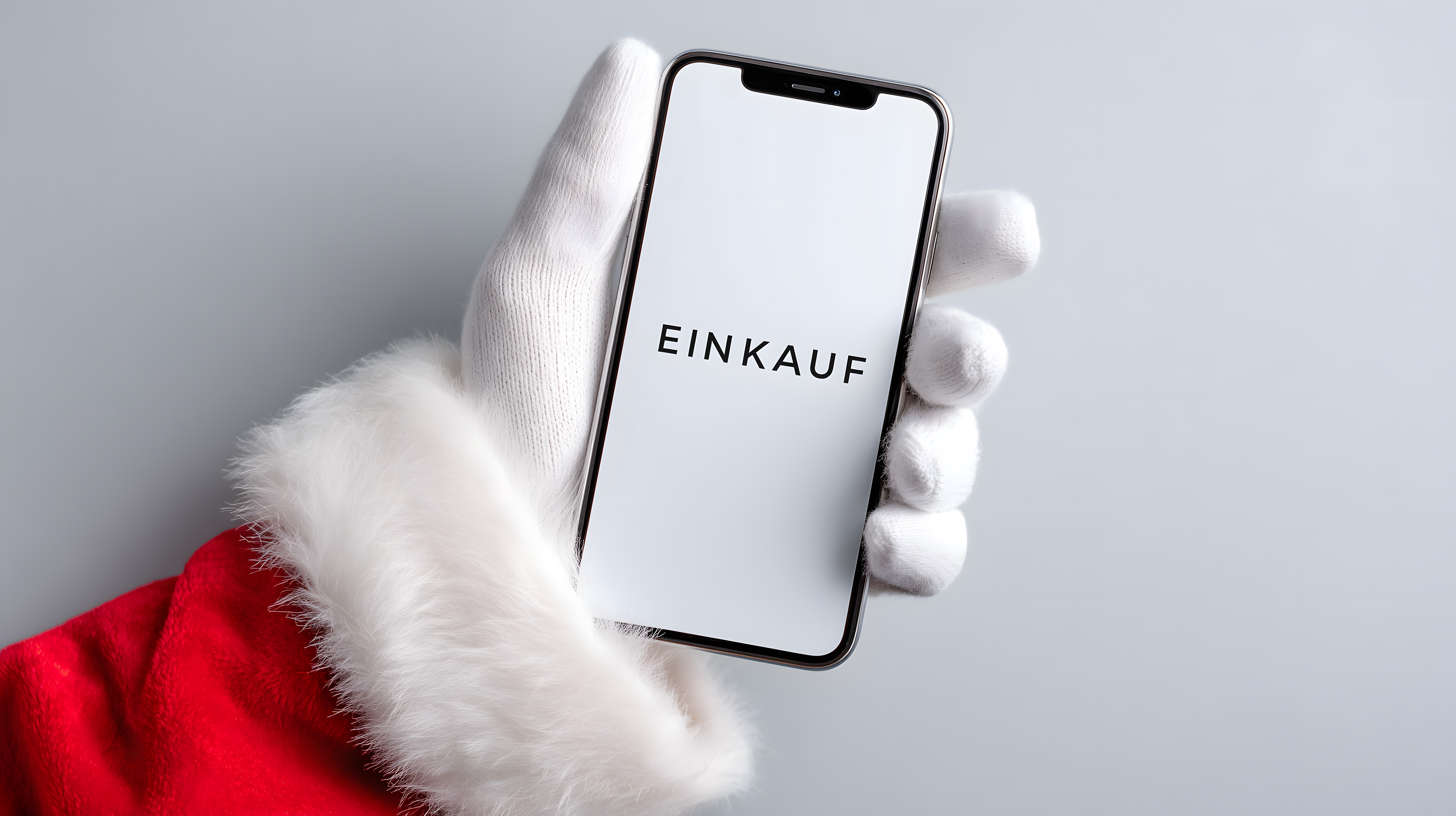 Das Bild zeigt eine Nahaufnahme einer Weihnachtsmannhand, die ein Smartphone mit dem Text 'EINKAUF' darauf hält. Die Farben sind reduziert auf Weiß, Rot und Grau, was eine stimmungsvolle, winterliche Atmosphäre erzeugt. Das Bild eignet sich hervorragend als Titelbild für einen Blogbeitrag zum Thema Weihnachtseinkäufe, als Werbegrafikvorlage für Social-Media-Kampagnen oder als Newsletter-Gestaltungselement. Dieses hochauflösende, kostenlose Stockfoto unter Creative-Commons-Lizenz kann vielseitig eingesetzt werden.