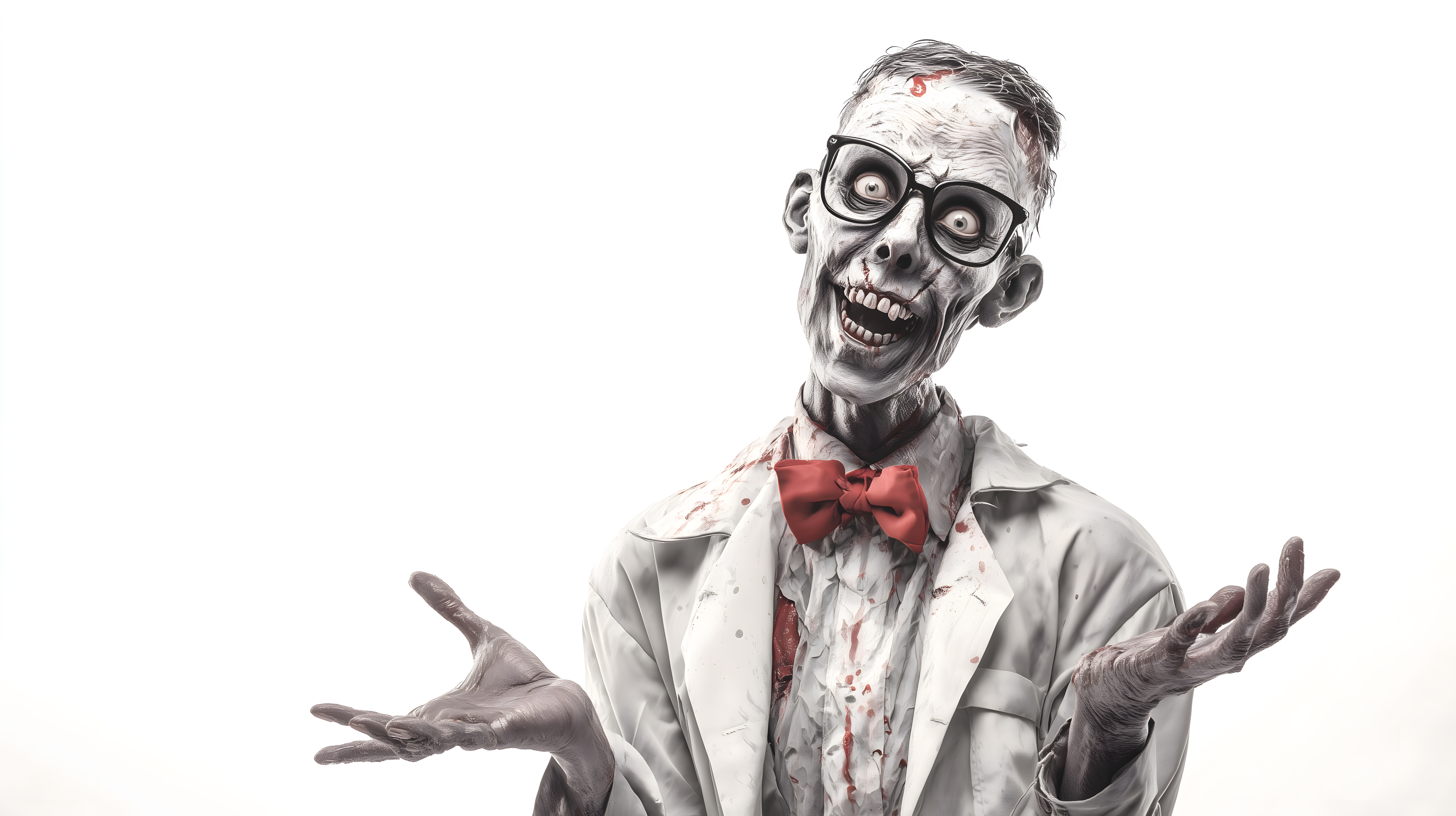 Das Bild zeigt einen gruseligen Wissenschaftler in einer Comic-Optik. Der Charakter hat eine extrem verzerrte, zombiehafte Gesichtsstruktur mit weit aufgerissenen Augen, scharfen Zähnen und einem Schuss roter Farbe am Kinn, was den erschreckenden Eindruck noch verstärkt. Seine Kleidung, bestehend aus einem Laborkittel und einer roten Fliege, sowie die Brille runden das unheimliche Erscheinungsbild des Wissenschaftlers ab. Dieses Stockfoto in hoher Auflösung eignet sich hervorragend für Halloween-Projekte, Horrorfilme, Comic-Illustrationen oder andere gruselige Kontexte und ist unter einer Creative-Commons-Lizenz frei nutzbar.