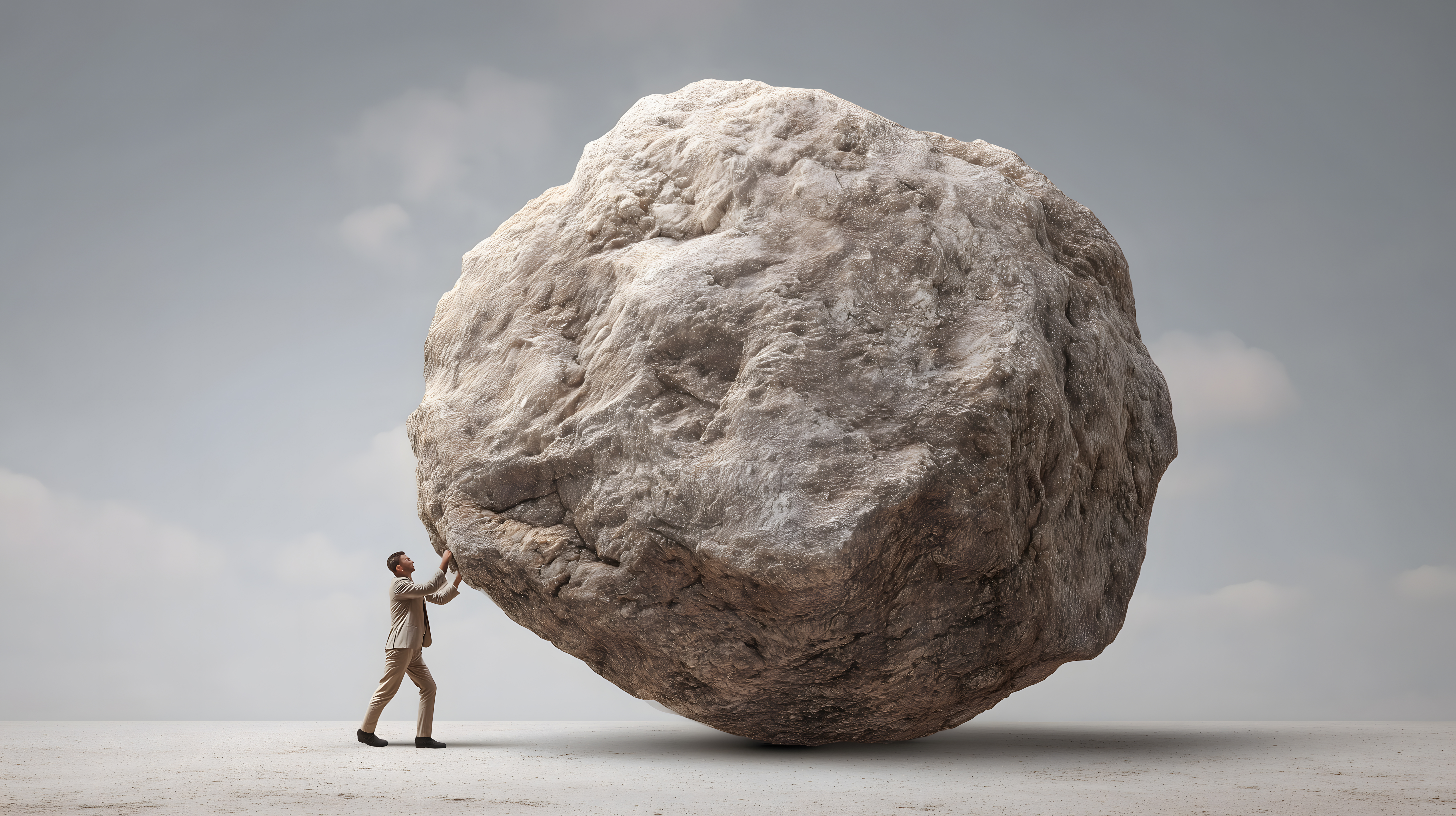 Das Bild zeigt einen Mann, der versucht, einen riesigen Felsbrocken zu bewegen oder vor sich herzuschieben. Die Szene stellt eine visuelle Metapher für Herausforderungen und schwierige Situationen dar, mit denen der Mensch konfrontiert sein kann. Der enorme Größenunterschied zwischen dem Mann und dem Felsen symbolisiert die oftmals übermächtig erscheinenden Hürden, die es zu überwinden gilt. Dieses Konzeptfoto kann in Präsentationen, Blogbeiträgen oder Werbekampagnen eingesetzt werden, um Themen wie Motivation, Zielstrebigkeit oder die Überwindung von Hindernissen bildlich zu vermitteln. Als kostenloses Stockfoto in hoher Auflösung und unter Creative-Commons-Lizenz ist es universell einsetzbar.