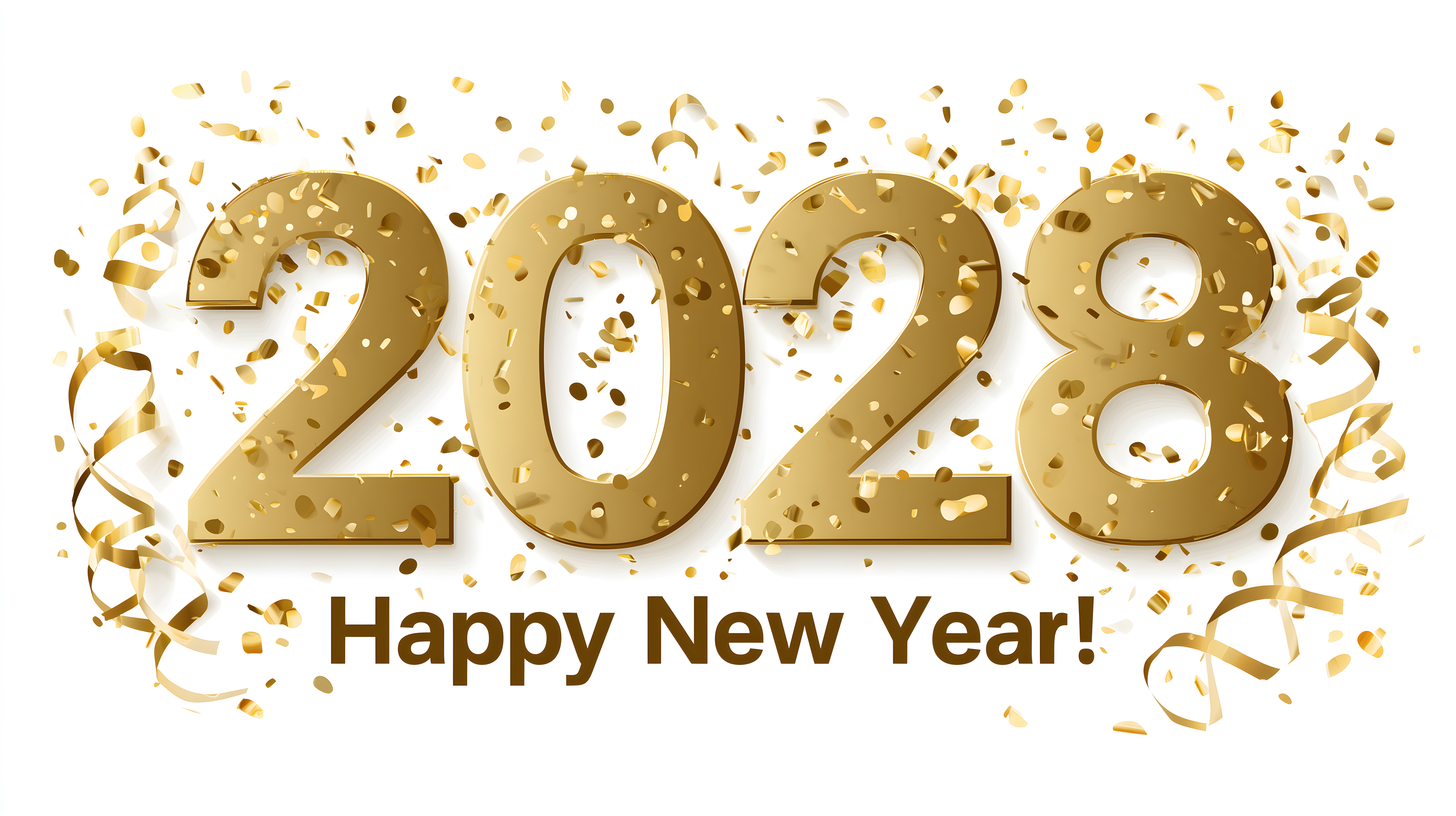Dieses festliche Stockfoto zeigt den Jahreswechsel 2028 mit goldenen, glänzenden 3D-Zahlen vor weißem Hintergrund. Um die Zahlen herum verteilen sich goldenes Konfetti und Partygirlanden, was eine feierliche und freudige Stimmung vermittelt. Das Bild eignet sich hervorragend für Neujahrs-Postings in sozialen Medien, Glückwunschkarten, Werbebanner oder Posterdesigns. Als hochauflösendes Stockfoto in hoher Qualität ist es auch für kommerzielle Zwecke frei nutzbar unter der Creative-Commons-Lizenz.