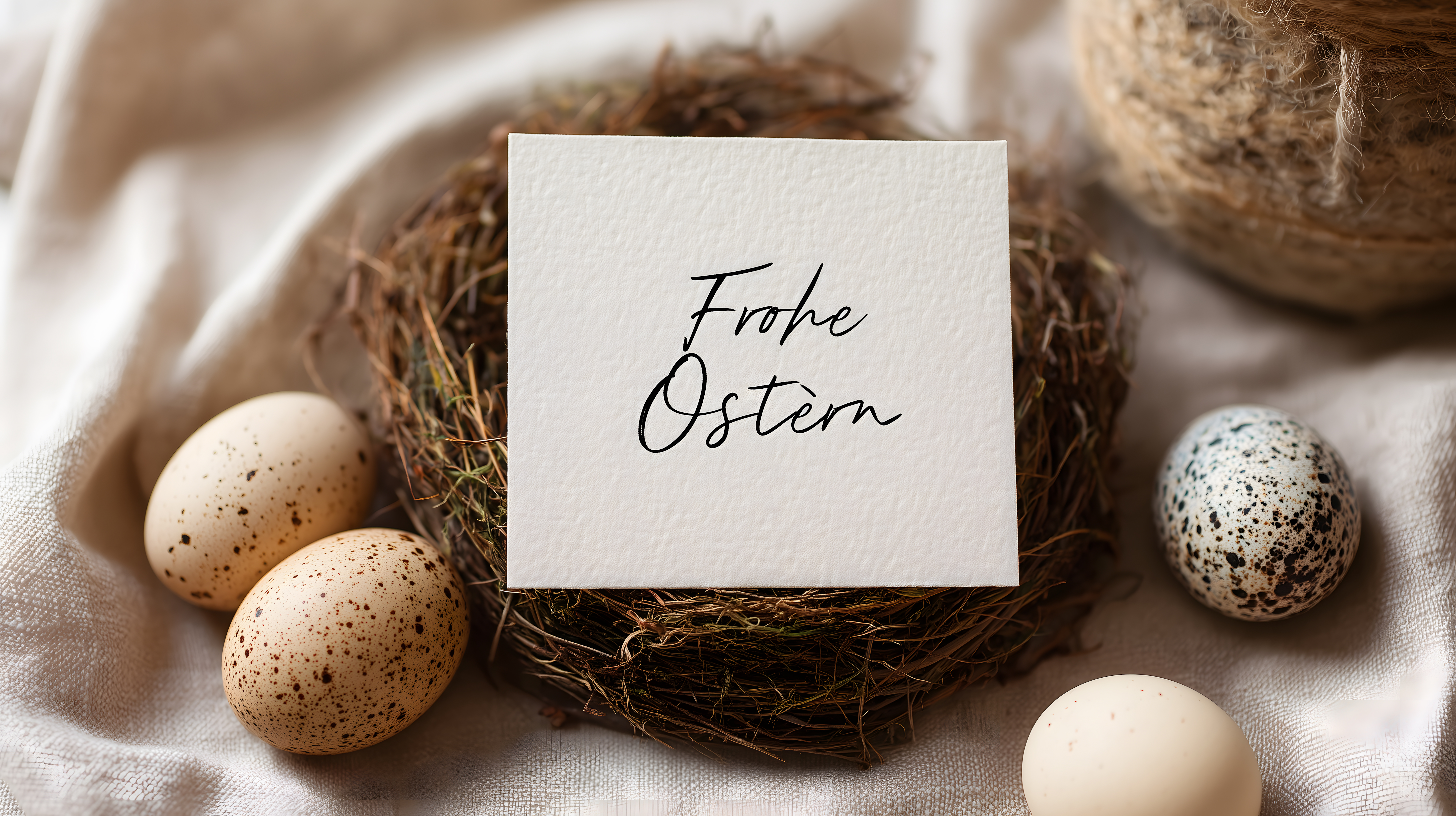 Das Bild zeigt eine schlichte, aber stimmungsvolle Ostergrußkarte, die in einem Nest mit feinen Strohhalmen platziert ist. Umgeben von natürlichen, sprenkelten Ostereiern in Beige- und Weißtönen, strahlt die Karte eine rustikale und boho-inspirierte Atmosphäre aus. Der minimalistische Text 'Frohe Ostern' in Handschrift unterstreicht den traditionellen, aber modernen Charakter des Motivs. Dieses Foto eignet sich hervorragend als kostenloses Stockfoto für Blogs, Social-Media-Beiträge oder Werbematerial rund um Ostern und Frühlingsgefühle. Die hochauflösende Qualität und Creative-Commons-Lizenz erlauben eine vielfältige Nutzung.