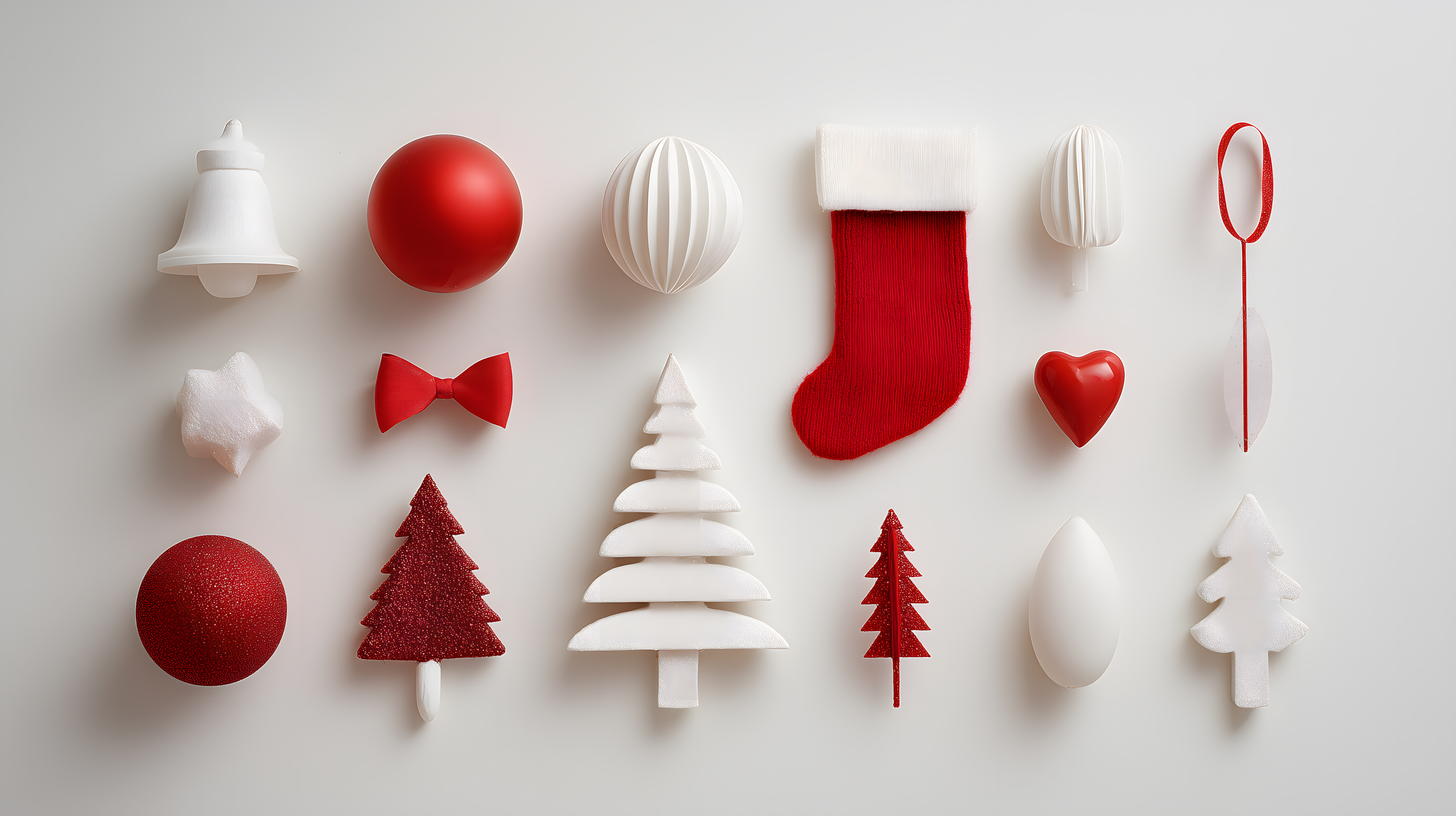 Dieses hochwertige Stockfoto zeigt eine festliche Weihnachtsdekoration in den Farben Rot und Weiß. Die Anordnung der verschiedenen Objekte wie Christbaumkugeln, Tannenbäume, Sterne und Schleifen in einem minimalistischen Flat-Lay-Stil verleiht dem Bild eine moderne, aufgeräumte Ästhetik. Das Foto eignet sich hervorragend für die Verwendung in Weihnachts-Blogs, Newsletter-Gestaltung, Werbematerialien oder Social-Media-Posts rund um die Feiertage. Das hochauflösende Bild steht unter einer Creative-Commons-Lizenz zur kostenlosen Verwendung zur Verfügung.