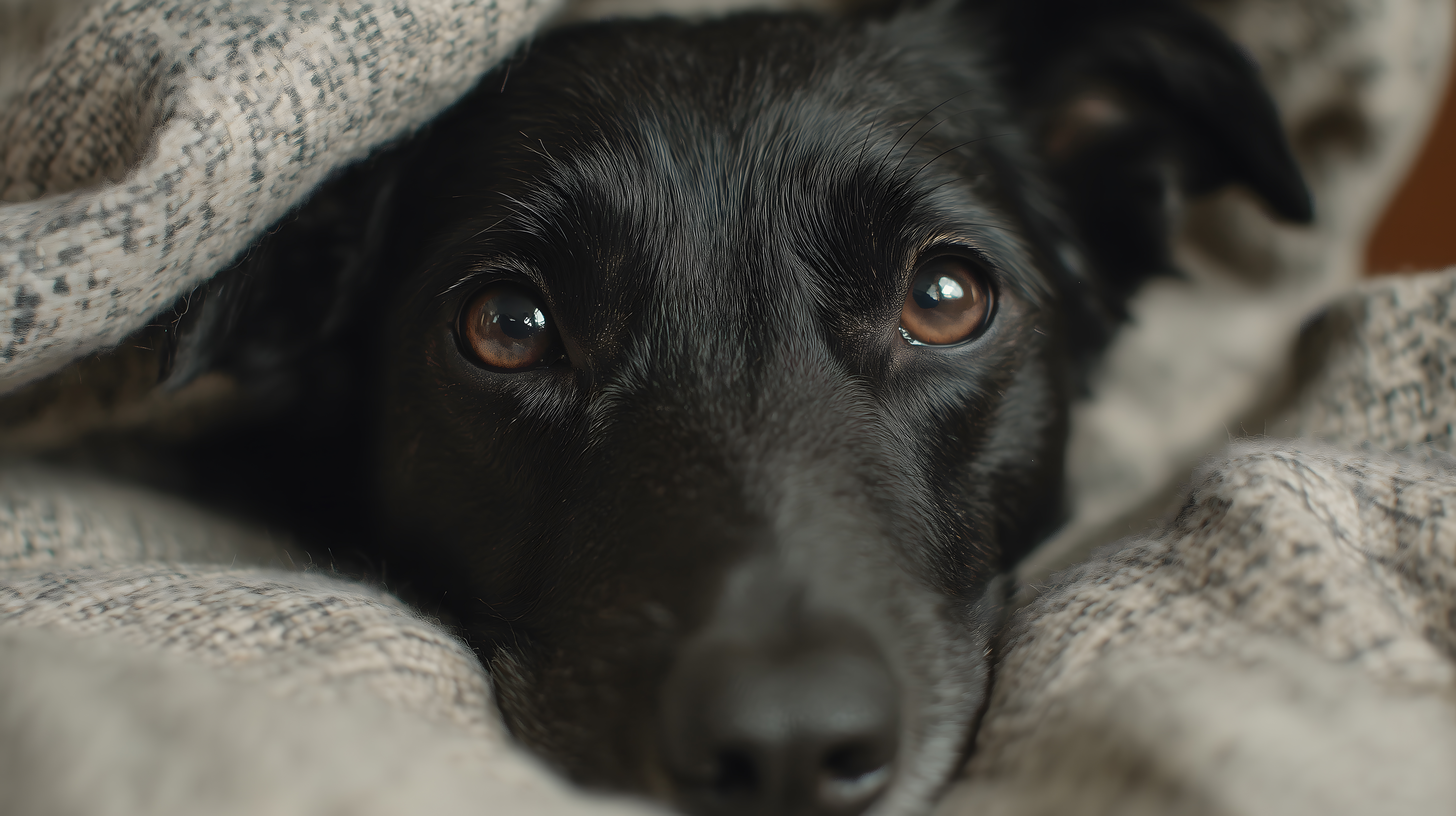 Das Foto zeigt einen friedlichen, schwarzen Hund, der sich unter einer weichen, grauen Decke eingekuschelt hat. Nur sein Kopf mit seinen großen, braunen Augen ist zu sehen. Das Bild vermittelt eine Atmosphäre der Ruhe und Entspannung. Es eignet sich hervorragend als kostenloses Stockfoto für Blogbeiträge, Newsletter, Social-Media-Postings oder Werbematerialien, bei denen ein gemütliches, heimeliges Motiv benötigt wird. Die hohe Auflösung und die Creative-Commons-Lizenz ermöglichen eine vielfältige Nutzung des Fotos.