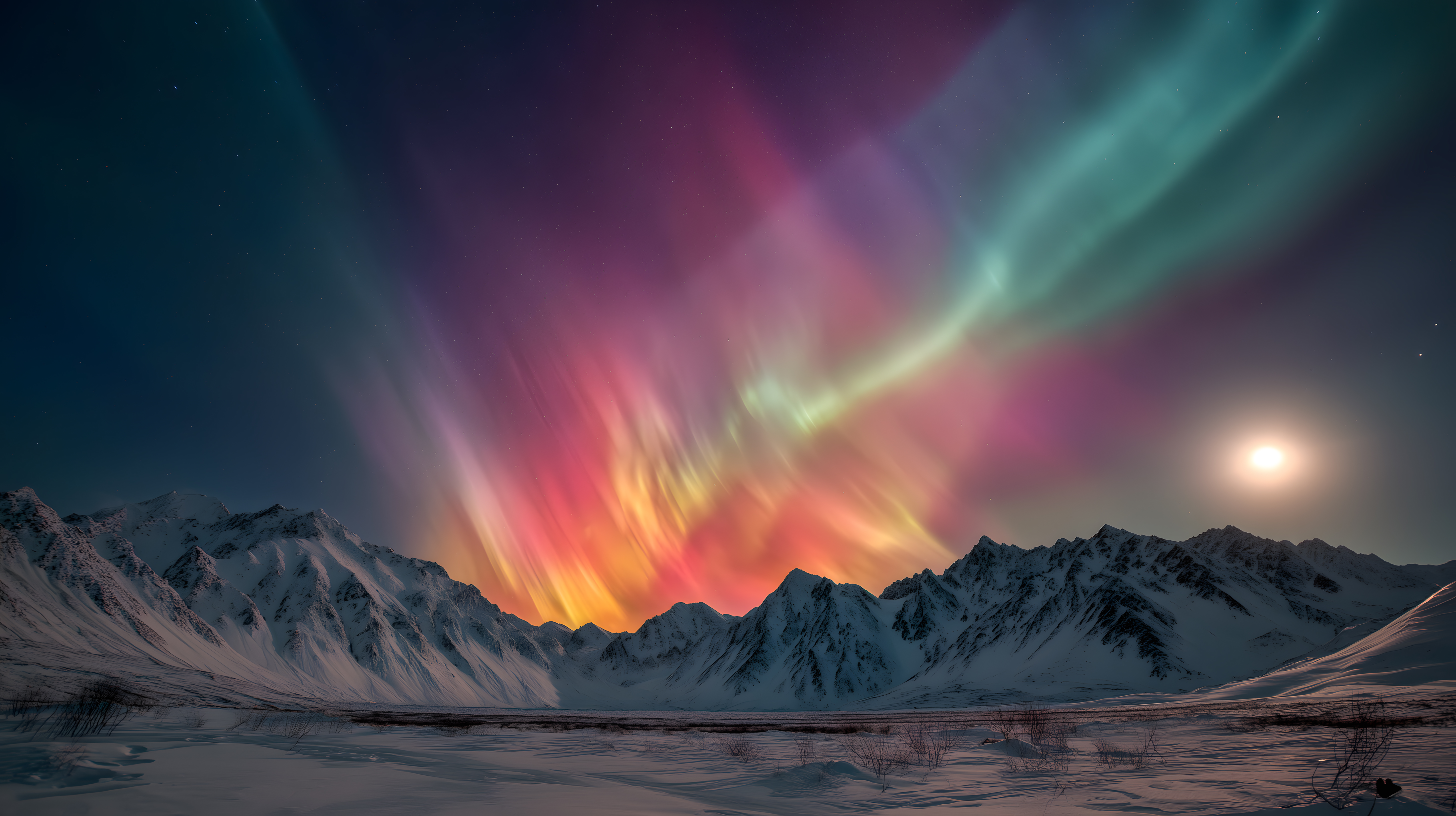 Das Bild zeigt eine atemberaubende Szene am Nachthimmel: Farbenfrohe Nordlichter tanzen über verschneite Berggipfel. Die Strahlen und Schlieren in Rot, Grün und Violett verleihen der Landschaft eine mystische Ausstrahlung. Aufgenommen wurde die Aufnahme vermutlich in einer abgelegenen Winterregion, wie etwa in Skandinavien oder der Arktis. Das Foto eignet sich hervorragend als Hintergrundbild für Blogs, Newsletter oder Werbung und ist in hoher Auflösung und unter einer Creative-Commons-Lizenz kostenlos verfügbar.