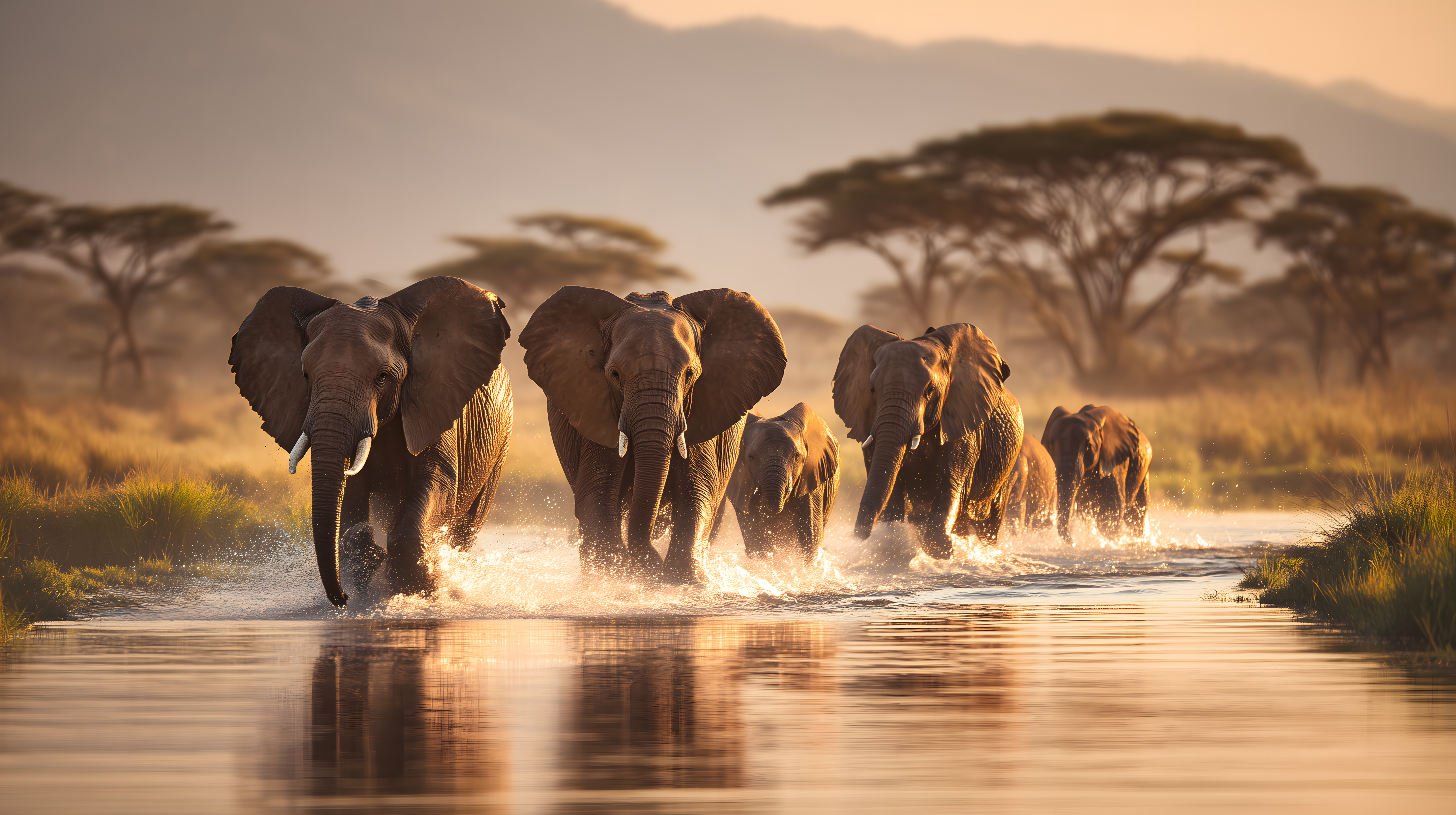 Dieses beeindruckende Foto zeigt eine Herde von Afrikanischen Elefanten, die durch ein seichtes Gewässer in der Savanne laufen. Die Tiere sind in einem warmen, goldenen Licht des Sonnenuntergangs zu sehen, das einen malerischen Kontrast zu ihren grauen Körpern bildet. Die Dynamik und Größe der Herde wird durch die Spiegelung im Wasser noch verstärkt. Dieses Bild eignet sich hervorragend für den Einsatz in Blogs, Newslettern, Social-Media-Beiträgen oder Werbematerialien rund um Themen wie Natur, Reisen, Tierschutz oder Afrika. Als kostenloses Stockfoto in hoher Auflösung und unter Creative-Commons-Lizenz kann es frei verwendet werden.
