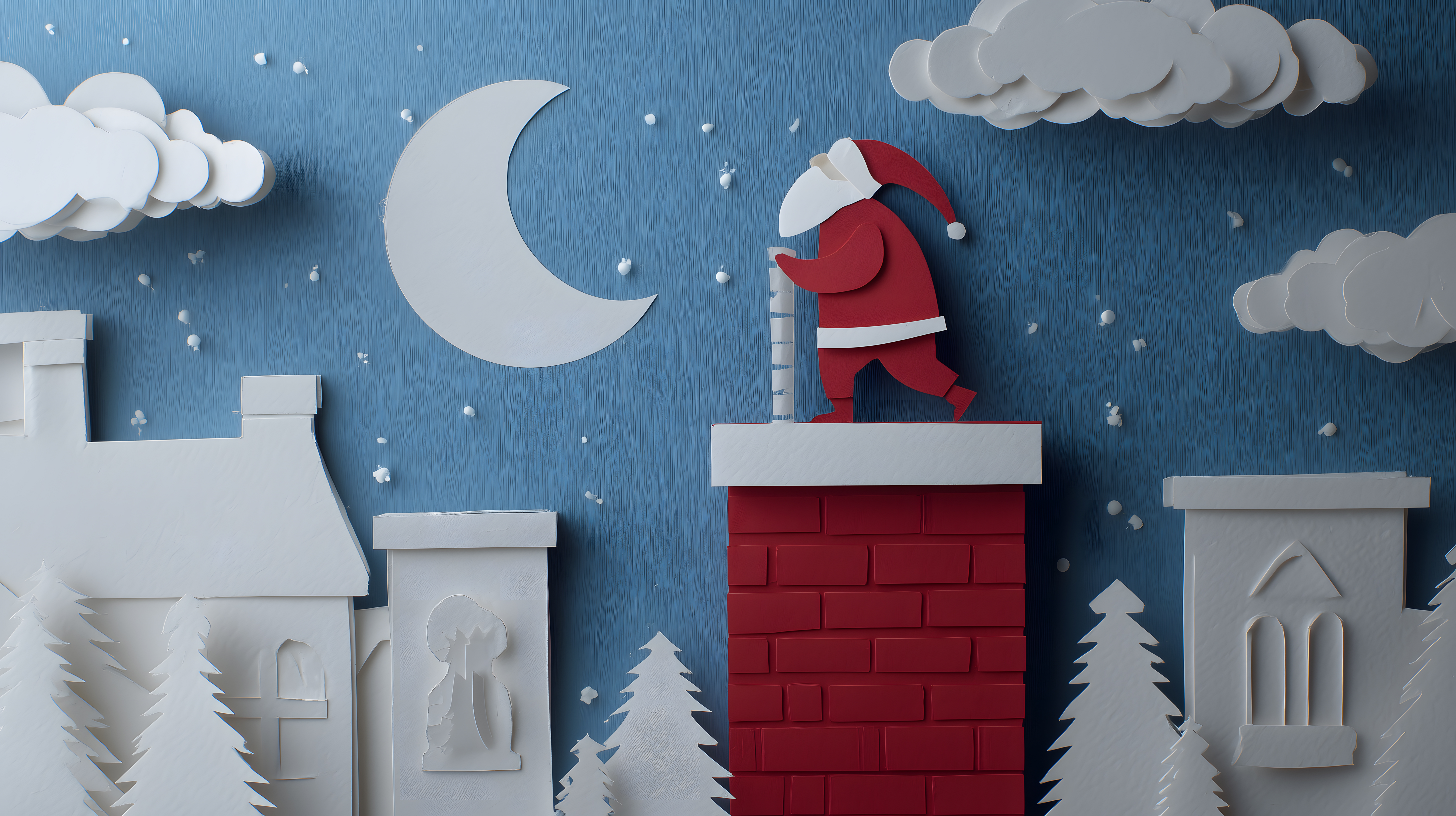 Dieses stimmungsvolle Foto zeigt eine liebevoll gestaltete Papierkunst-Winterlandschaft mit einem Weihnachtsmann, der auf einem roten Schornstein sitzt. Die Szenerie ist von einem Vollmond, verschneiten Häusern, Tannen und Wolken umgeben, die aus Papier geschnitten wurden. Die Verwendung von Papierkunst-Elementen verleiht dem Bild eine märchenhafte, einzigartige Optik. Dieses hochauflösende Foto eignet sich hervorragend für die Verwendung in Weihnachtsdekorationen, Blogbeiträgen, Werbematerialien oder Social-Media-Posts. Als kostenfreies Stockfoto unter einer Creative-Commons-Lizenz kann es vielseitig genutzt werden.