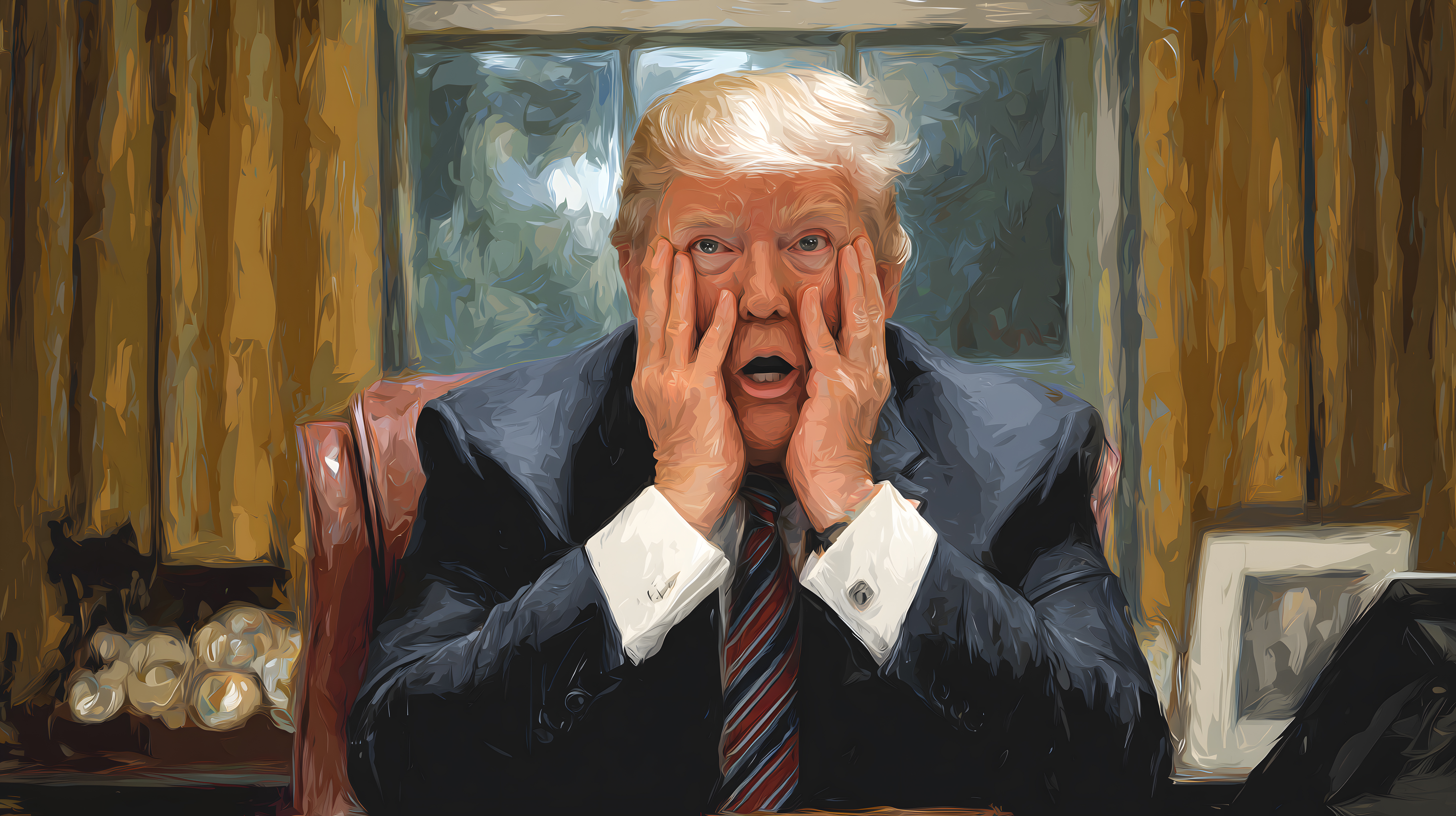 Das Foto zeigt einen älteren Mann in Anzug und Krawatte, der mit überraschtem Gesichtsausdruck sein Gesicht in den Händen verbirgt. Der Malereistil verleiht dem Bild eine künstlerische, fotorealistische Anmutung. Die Szene lässt auf eine angespannte, besorgte Situation schließen, in der sich der Geschäftsmann befindet. Das Foto eignet sich hervorragend für den Einsatz in Geschäftsberichten, Blogbeiträgen oder Werbekampagnen, die emotionale Aspekte des Unternehmensalltags thematisieren. Als hochwertiges, kostenloses Stockfoto unter Creative-Commons-Lizenz steht es für vielfältige Verwendungsmöglichkeiten zur Verfügung.