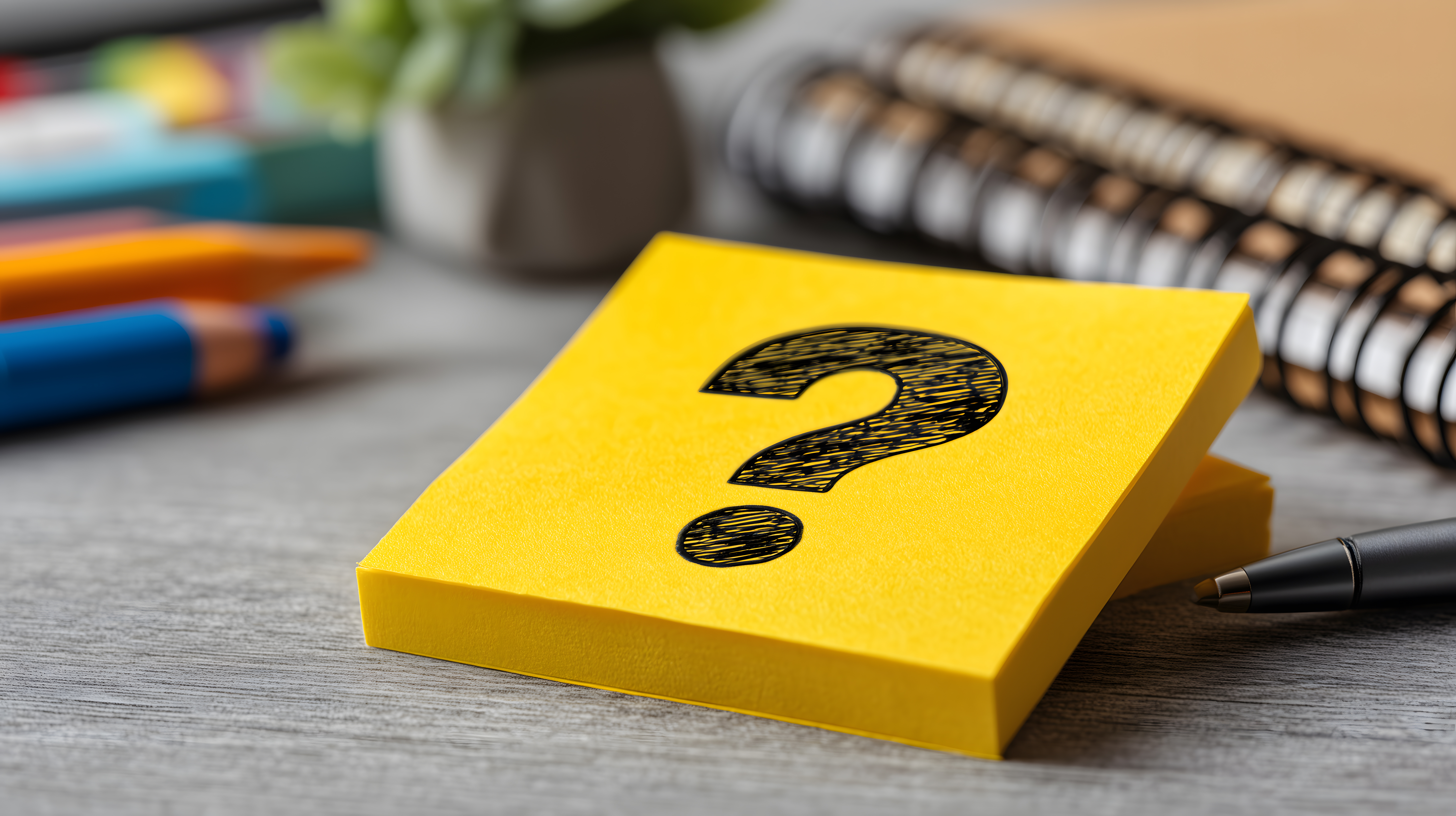 Dieses farbenfroh gestaltete Foto zeigt einen gelben Notizzettel mit einem großen schwarzen Fragezeichen darauf, der auf einem Schreibtisch in einem Büroumfeld platziert ist. Der Notizzettel steht inmitten von Arbeitsmaterialien wie Stiften, Notizbüchern und einer Pflanze, was ein kreatives und inspirierendes Arbeitsumfeld suggeriert. Das Bild vermittelt den Eindruck von Ideenfindung, Brainstorming und der Suche nach Lösungen für offene Fragen. Es eignet sich hervorragend als kostenloses Stockfoto für Beiträge zu Themen wie Geschäftsentwicklung, Produktmanagement oder Entscheidungsfindung in hoher Qualität und unter Creative-Commons-Lizenz.