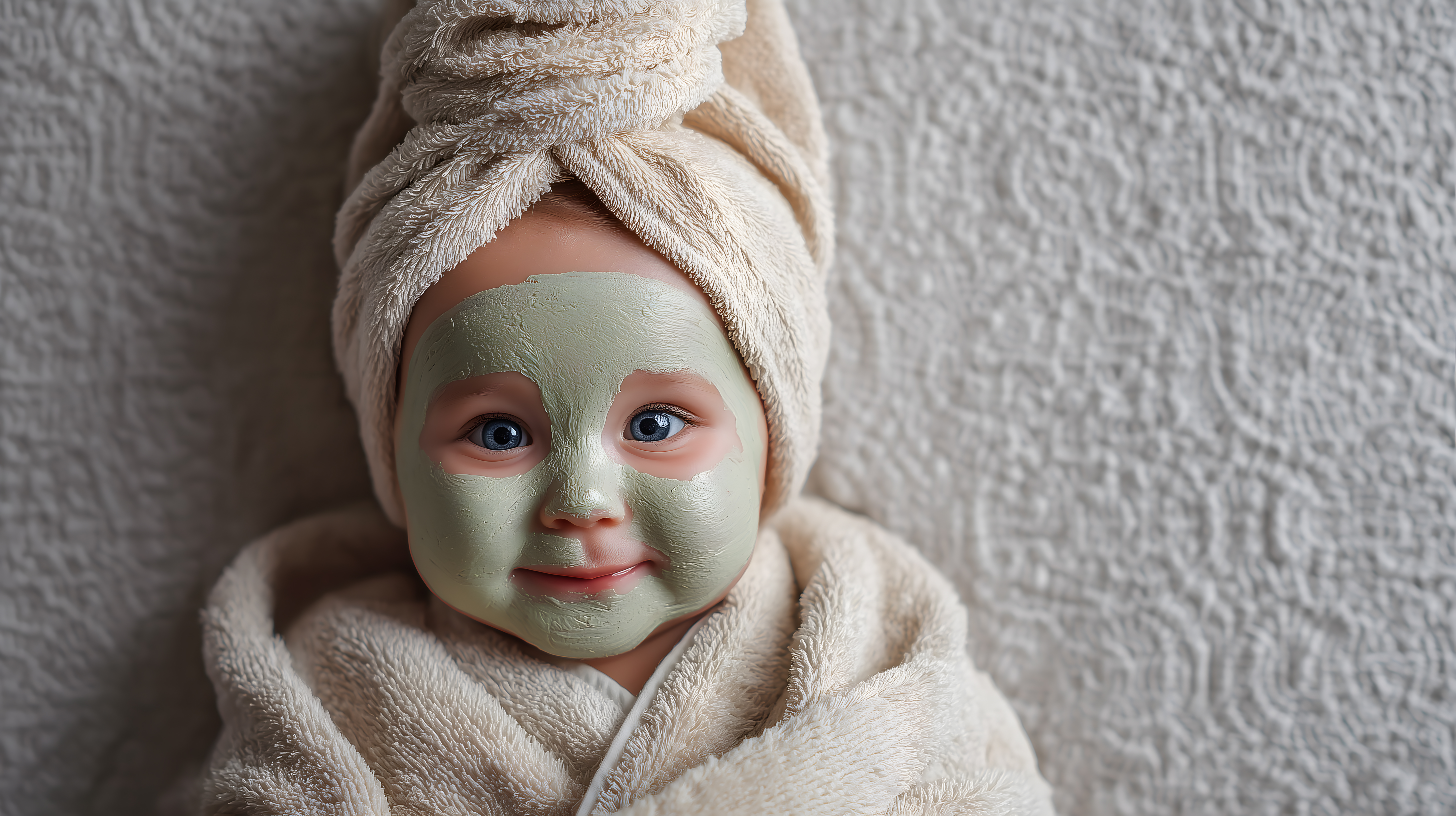 Das Bild zeigt ein niedliches Baby, das in ein beiges Handtuch eingewickelt ist und eine grüne Gesichtsmaske trägt. Der Fokus liegt auf dem Gesichtsausdruck des Kindes, das mit seinen blauen Augen und einem leichten Lächeln direkt in die Kamera blickt. Der Hintergrund ist einfarbig und hellgrau, wodurch der Blick auf das Kleinkind gelenkt wird. Dieses Foto eignet sich hervorragend als kostenloses Stockfoto für Blogs, Newsletter, Social Media und Werbematerialien rund um Themen wie Wellness, Entspannung, Babypflege und Beautyroutinen. Es ist in hoher Auflösung und unter einer Creative-Commons-Lizenz verfügbar.