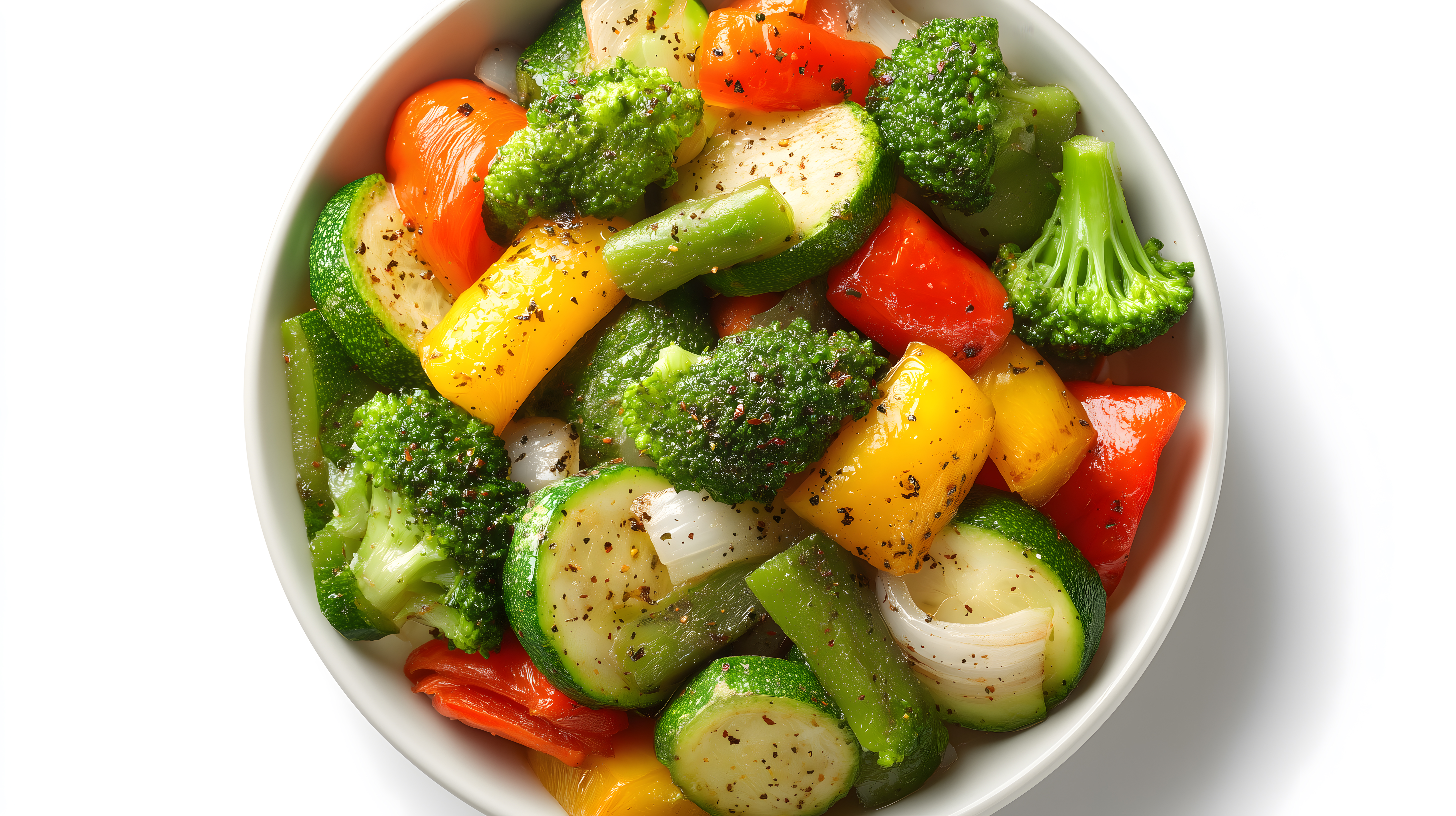 Das Foto zeigt eine Schüssel mit einem bunten, frischen Gemüsemix. Zu sehen sind grüner Brokkoli, rote und gelbe Paprikastücke sowie grüne Zucchini, die in einer schlichten, weißen Schale angerichtet sind. Die Zutaten sind mit Gewürzen wie Pfeffer und Salz abgeschmeckt, was dem Gericht eine appetitliche Optik verleiht. Das Foto eignet sich hervorragend als Stockfoto für Blogs, Social-Media-Kanäle oder Werbezwecke rund um gesunde, vegetarische Ernährung. Es ist in hoher Auflösung und unter einer Creative-Commons-Lizenz frei nutzbar.