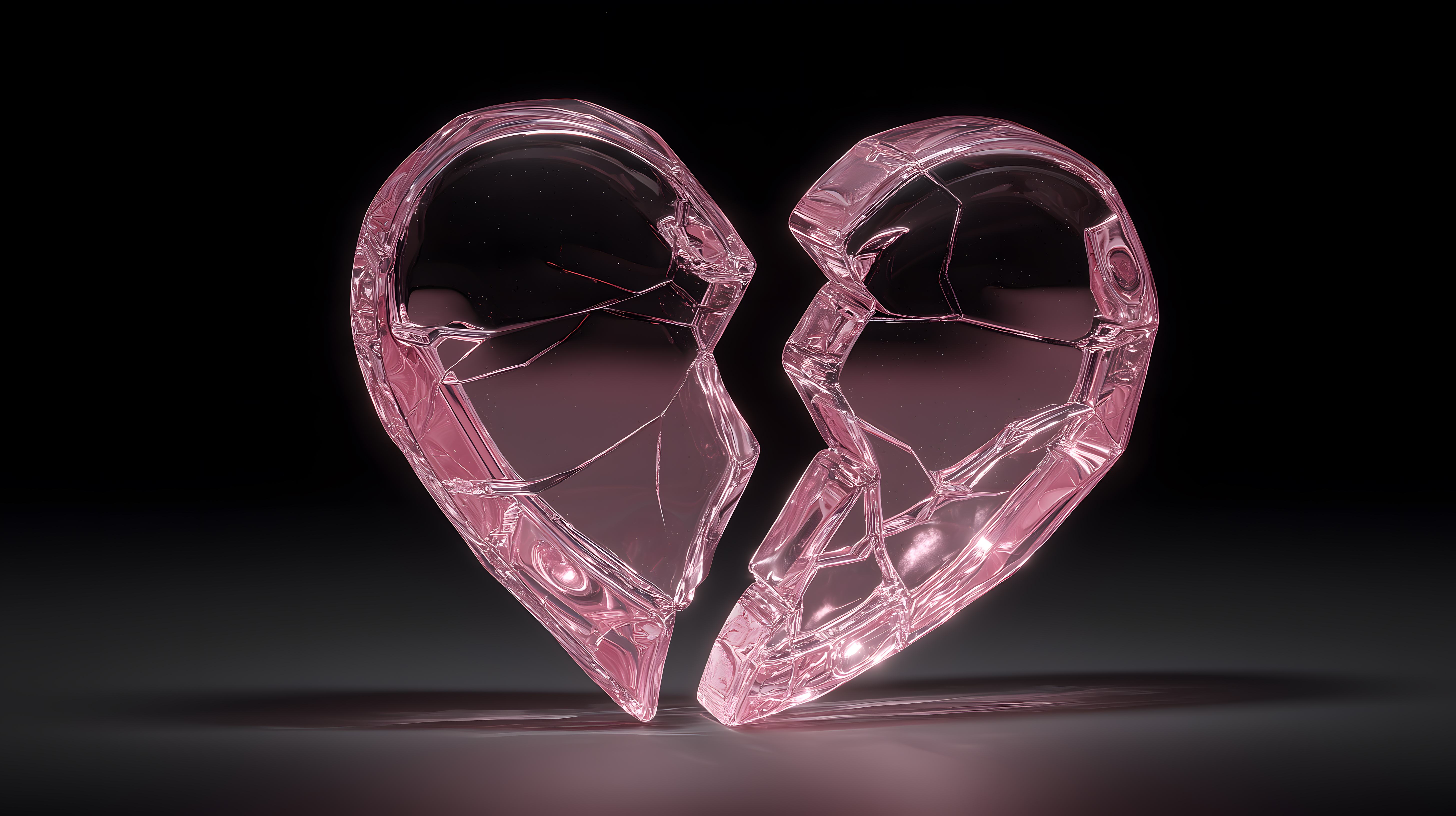 Das Bild zeigt ein zerbrochenes rosa Glasherz vor einem schwarzen Hintergrund. Das Herz ist in zwei Hälften zersprungen, die leicht voneinander getrennt sind. Das Motiv repräsentiert Konzepte wie Liebe, Beziehung, Einsamkeit, Trauer und Schmerz. Die minimalistische, dunkle Komposition erzeugt eine starke, symbolische Wirkung. Dieses kostenlose Stockfoto in hoher Auflösung kann für verschiedene Zwecke wie Blogs, Newsletter, Social-Media-Beiträge oder Werbematerial verwendet werden und steht unter einer Creative-Commons-Lizenz zur Verfügung.