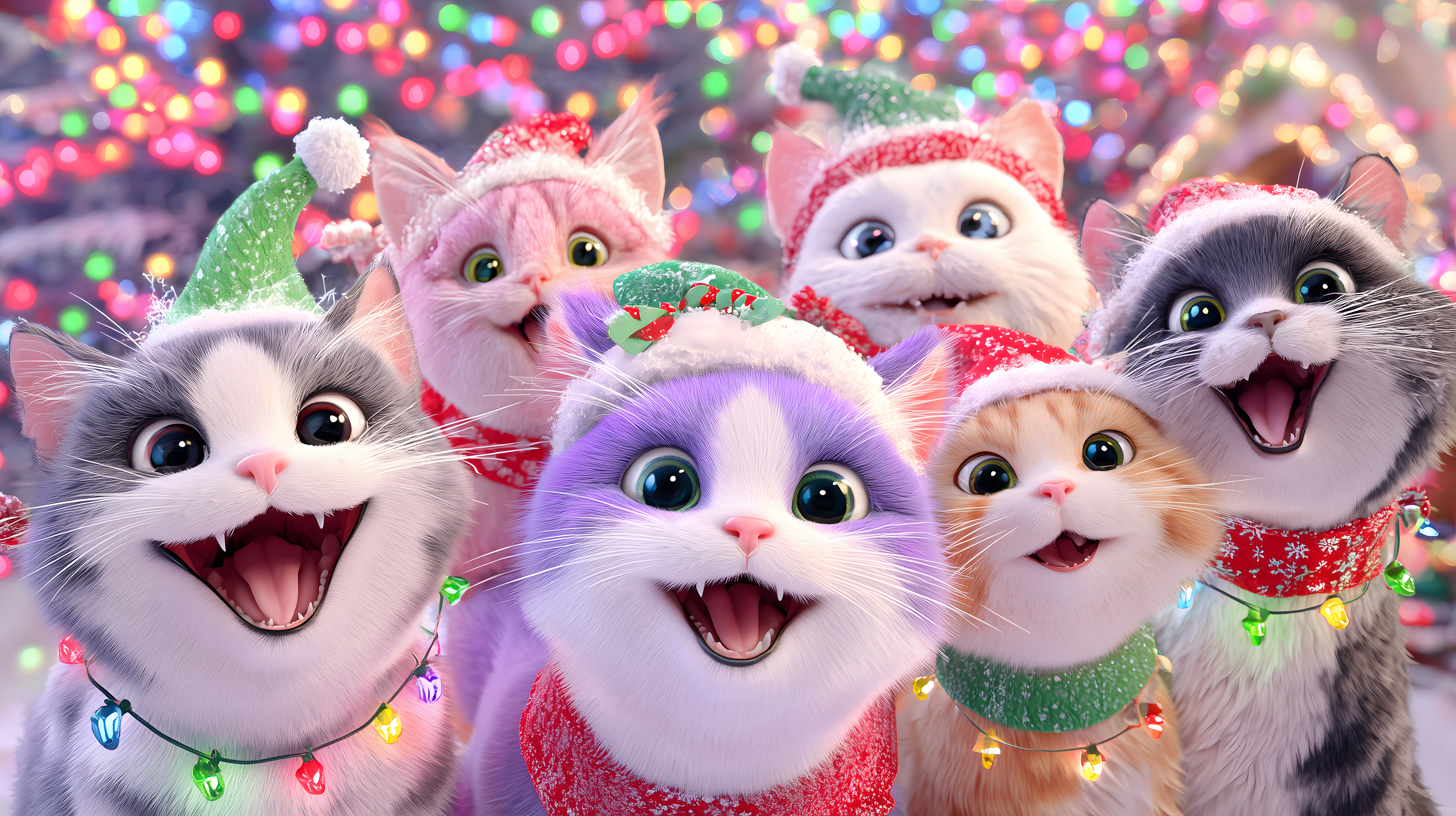 Das Bild zeigt eine Gruppe niedlicher, fröhlich wirkender Katzen in Weihnachtsdekor vor einer bunten Lichterkette. Die Katzen sind mit festlichen Mützen, Schals und Kränzen geschmückt und haben große, strahlende Augen. Die Komposition ist farbenfroh und dynamisch, was eine festliche Stimmung vermittelt. Dieses kostenlose Stockfoto in hoher Auflösung kann in Blogs, Newslettern, Social-Media-Beiträgen oder Werbekampagnen rund um die Weihnachtszeit eingesetzt werden und ist unter der Creative-Commons-Lizenz frei nutzbar.