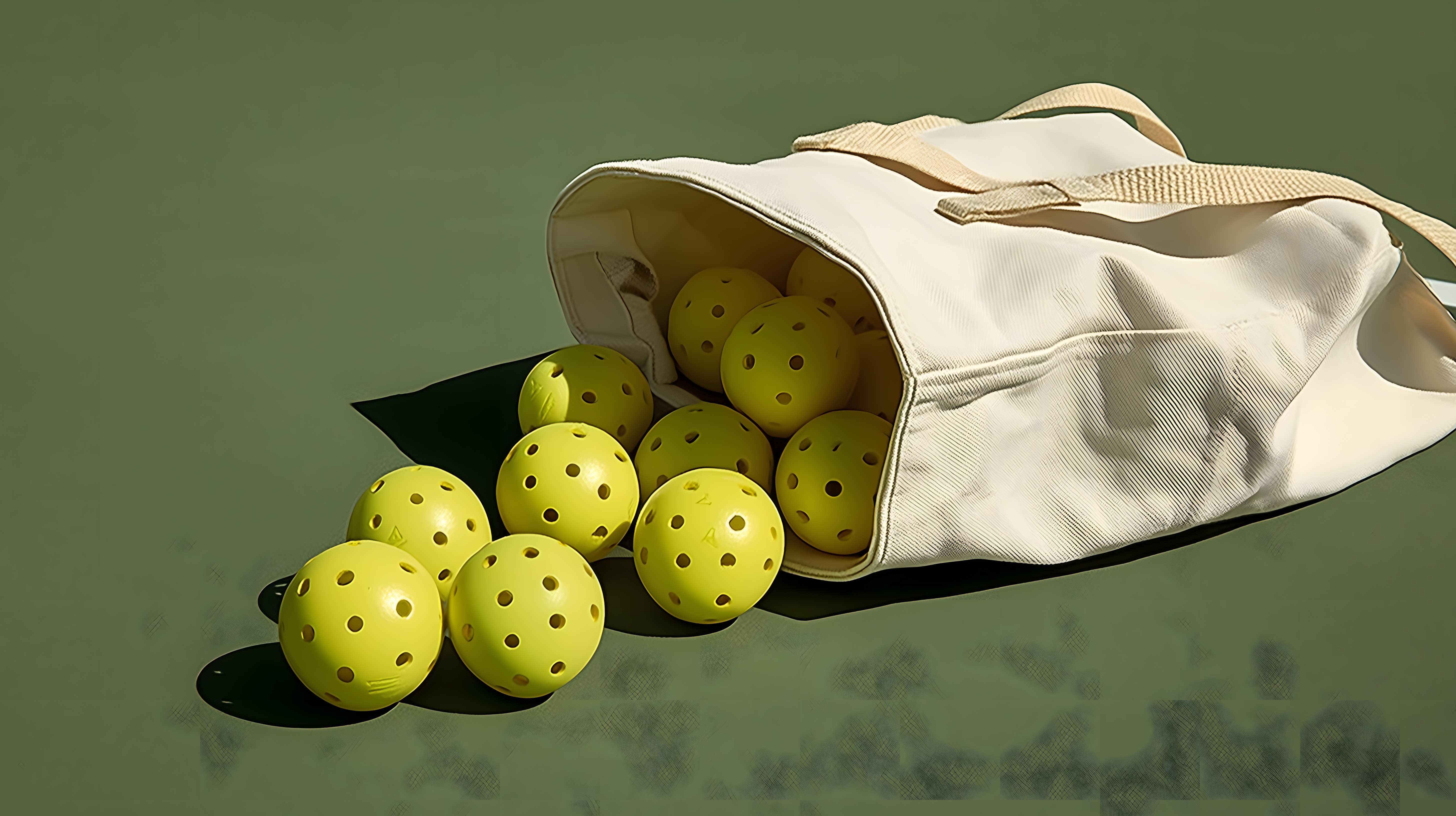 Das Bild zeigt eine Reihe von gelben, gepunkteten Pickleball-Bällen, die aus einer weißen Sporttasche herausfallen. Der Kontrast zwischen den leuchtenden Bällen und der schlichten Tasche vor einem einfarbigen grünen Hintergrund erzeugt eine stimmungsvolle, minimalistische Optik. Diese Aufnahme eignet sich hervorragend als kostenloses Stockfoto für Artikel oder Social-Media-Beiträge rund um Sportarten, Freizeitaktivitäten und einen aktiven Lebensstil. In hoher Auflösung und unter der Creative-Commons-Lizenz verfügbar, lässt sich das Bild vielseitig einsetzen.
