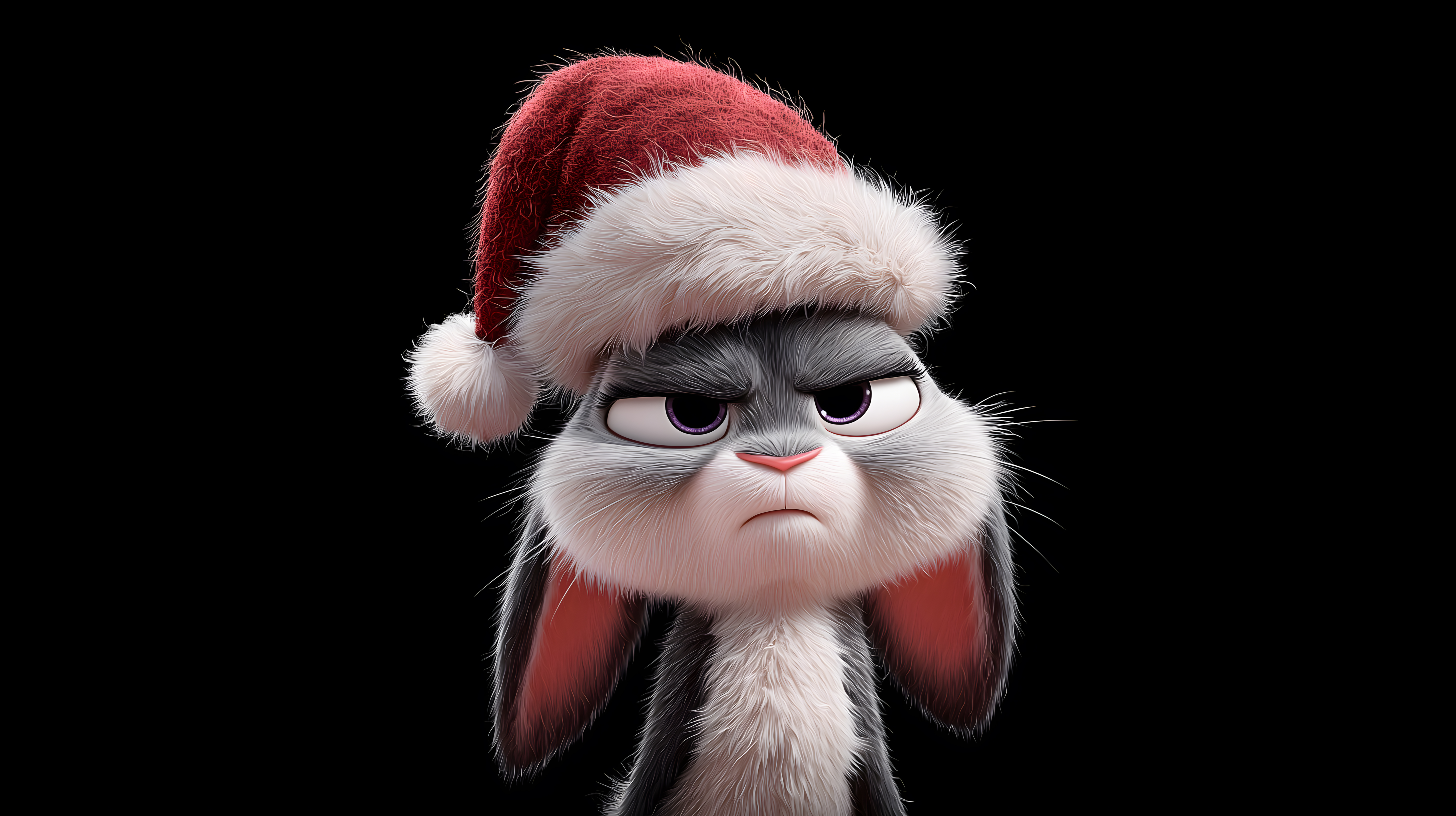 Dieses Foto zeigt eine griesgrämige Cartoon-Darstellung eines Kaninchens, das eine rote Weihnachtsmütze trägt. Das flauschige Fell des Tieres ist in hellen und dunklen Grautönen gehalten, was einen Kontrast zu dem schwarzen Hintergrund bildet. Der Gesichtsausdruck des Kaninchens ist etwas missmutig, was den Betrachter schmunzeln lässt. Dieses Bild eignet sich hervorragend als kostenloses Stockfoto für weihnachtliche oder winterliche Designs in hoher Auflösung und unter einer Creative-Commons-Lizenz. Es kann beispielsweise in Blogbeiträgen, Newslettern oder Social-Media-Postings zu Weihnachten eingesetzt werden.
