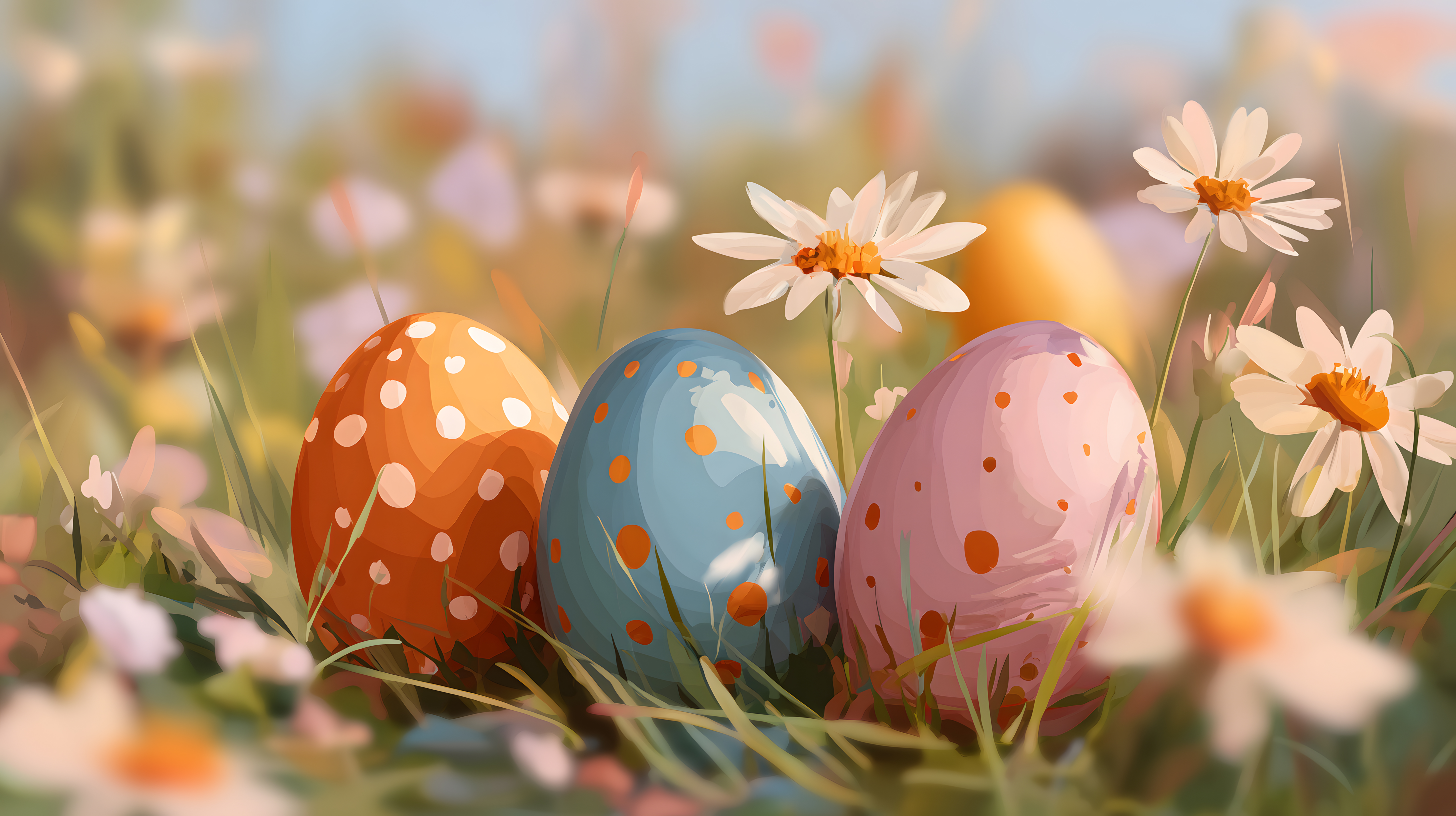 Das Bild zeigt eine bunte Szene in einer Frühlingswiese. Im Vordergrund sind mehrere dekorativ bemalte Ostereier zu sehen, die zwischen den grünen Grashalmen und weißen Gänseblümchen platziert sind. Die Eier haben verschiedene Farben und Muster, wie Punkte oder Sprenkel, die ihnen ein fröhliches, verspieltes Aussehen verleihen. Die Szene strahlt eine heitere, frische Atmosphäre aus und könnte ideal als Titelbild für einen Osterartikel, als Social-Media-Beitrag oder als Hintergrund für Werbemittel verwendet werden. Dieses hochauflösende, kostenlose Stockfoto unter Creative-Commons-Lizenz bietet viele Einsatzmöglichkeiten für Ihre Projekte.