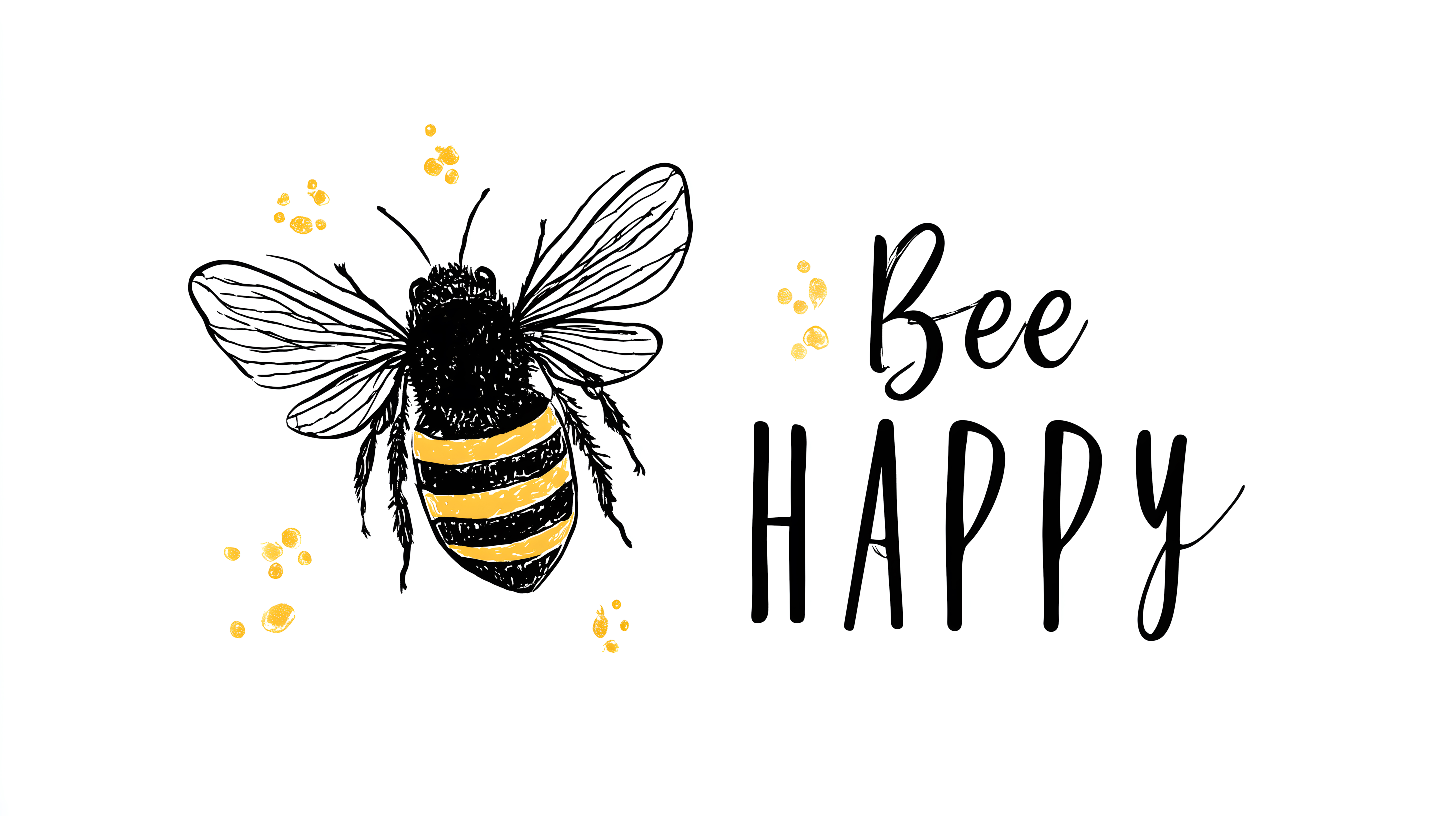 Diese detaillierte Illustration zeigt eine schwarz-weiße Honigbiene vor einem einfachen weißen Hintergrund. Die Biene hat eine charakteristische Körperstruktur mit Flügeln und Streifen-Muster. Ihr Körper ist mit feinen Linien gezeichnet, was dem Bild eine natürliche, handgemachte Ästhetik verleiht. Zusätzlich finden sich einige gelbe Pollen-Partikel, die um die Biene herumschweben. Darunter befindet sich der typografische Schriftzug 'Bee Happy' in einer eleganten, modernen Schrift.