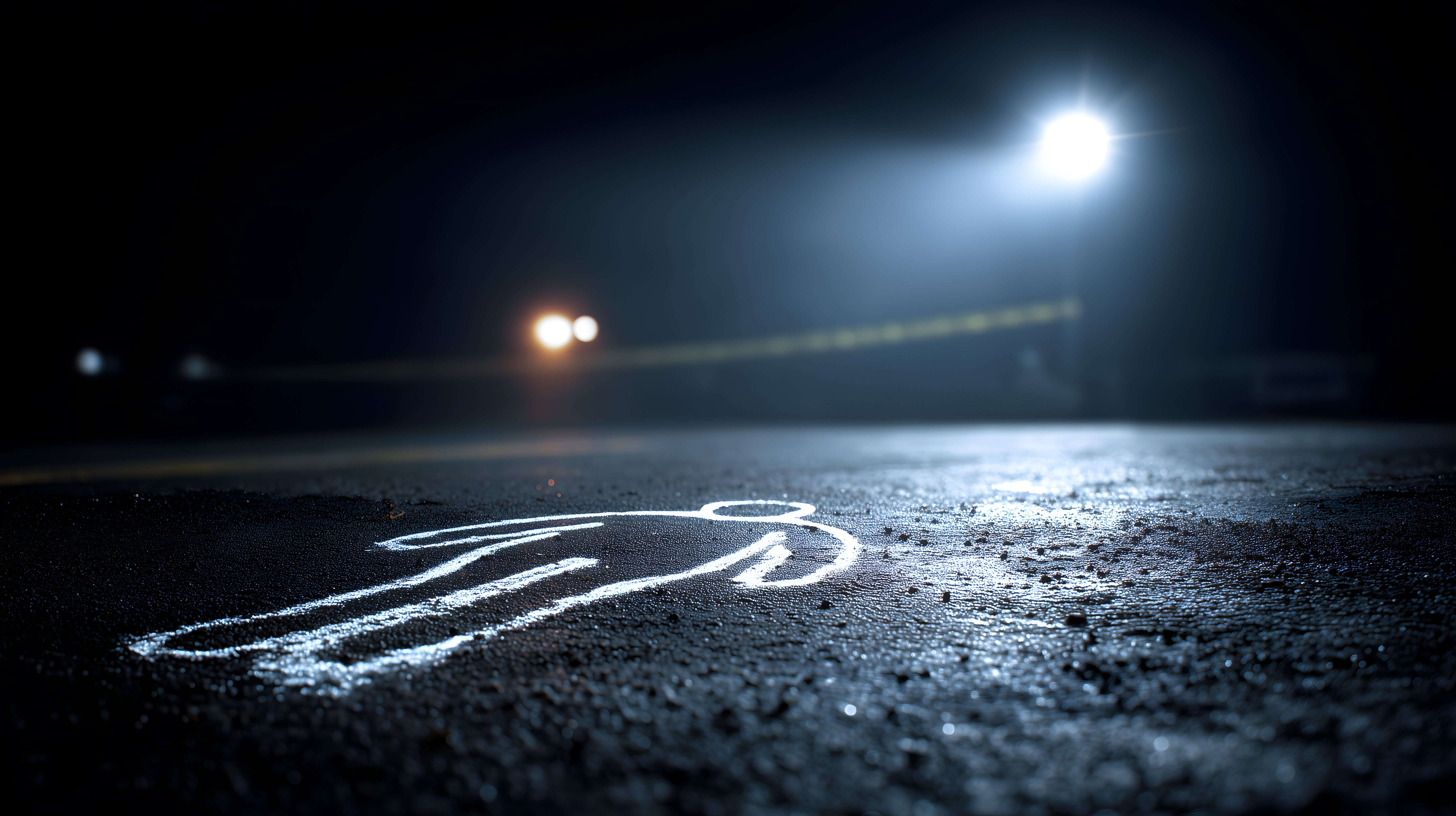 Das Bild zeigt eine düstere nächtliche Szenerie. Im Vordergrund ist ein Kreideumriss auf der Straße zu sehen, der offensichtlich den Umriss einer Leiche darstellt. Die Straße ist nur spärlich beleuchtet, wobei ein heller Scheinwerfer den Kreideumriss hervorhebt. Der Hintergrund ist dunkel und mystisch, mit einem Fahrzeug, dessen Scheinwerfer einen Teil der Szene erhellen. Die Gesamtatmosphäre ist sehr spannungsgeladen und kriminell. Dieses Stockfoto eignet sich hervorragend für Blogbeiträge, Newsletter oder Social-Media-Posts in den Bereichen Kriminalität, Thriller, Mystery oder Ermittlungen. Das hochauflösende Bild ist unter einer Creative-Commons-Lizenz frei verwendbar.