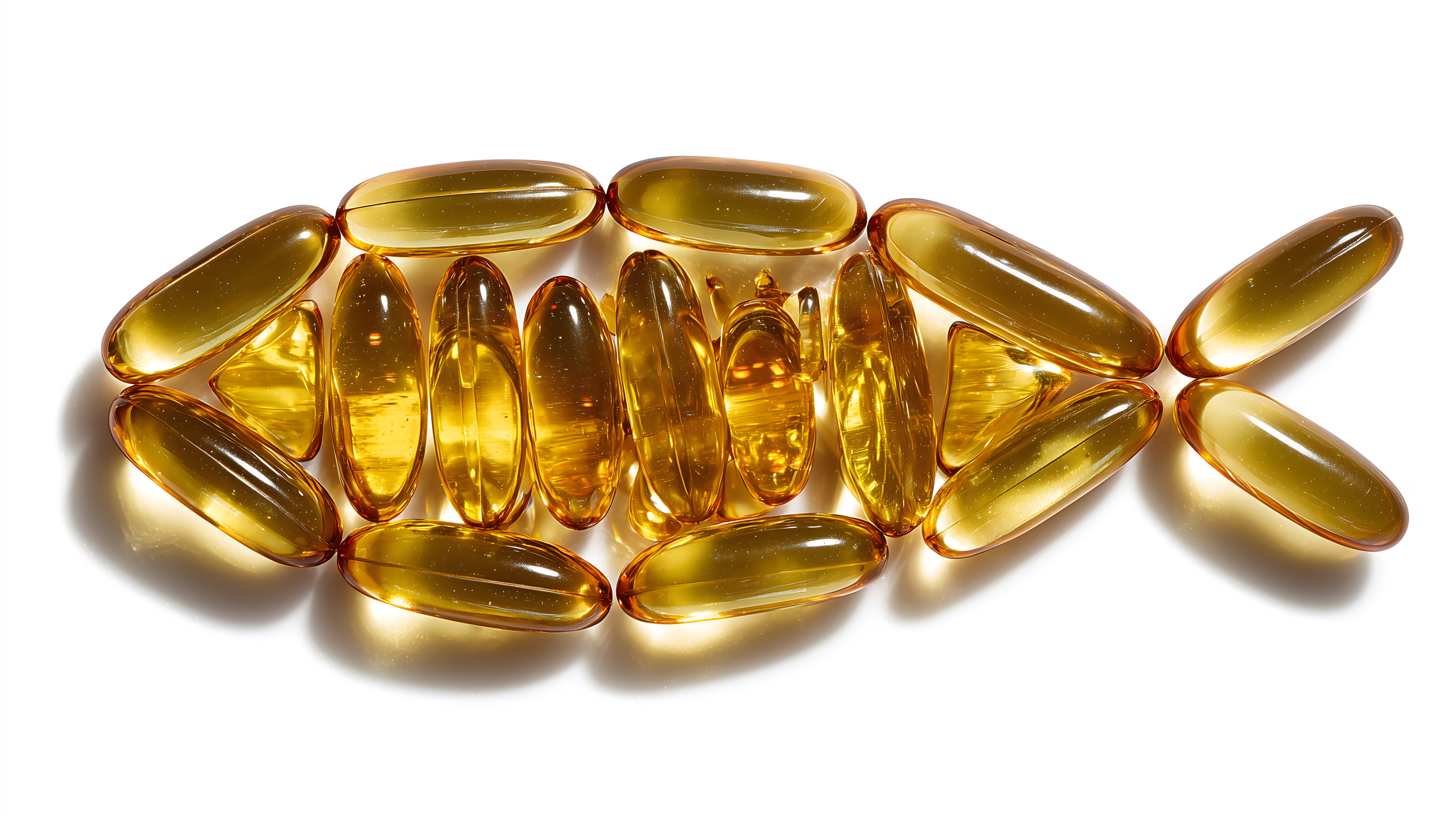 Das Bild zeigt eine Ansammlung von Omega-3-Softgel-Kapseln auf weißem Hintergrund. Die großen, ovalen Kapseln haben eine gelbe, transparente Farbe und glänzende Oberfläche, die den Inhalt der Kapseln durchscheinen lässt. Dieses hochauflösende Stockfoto eignet sich ideal für Verwendung in Blogbeiträgen, Newslettern, Social-Media-Posts oder Werbekampagnen rund um das Thema Nahrungsergänzungsmittel, Gesundheit und Wellness. Es ist unter einer Creative-Commons-Lizenz verfügbar und kann kostenfrei genutzt werden.