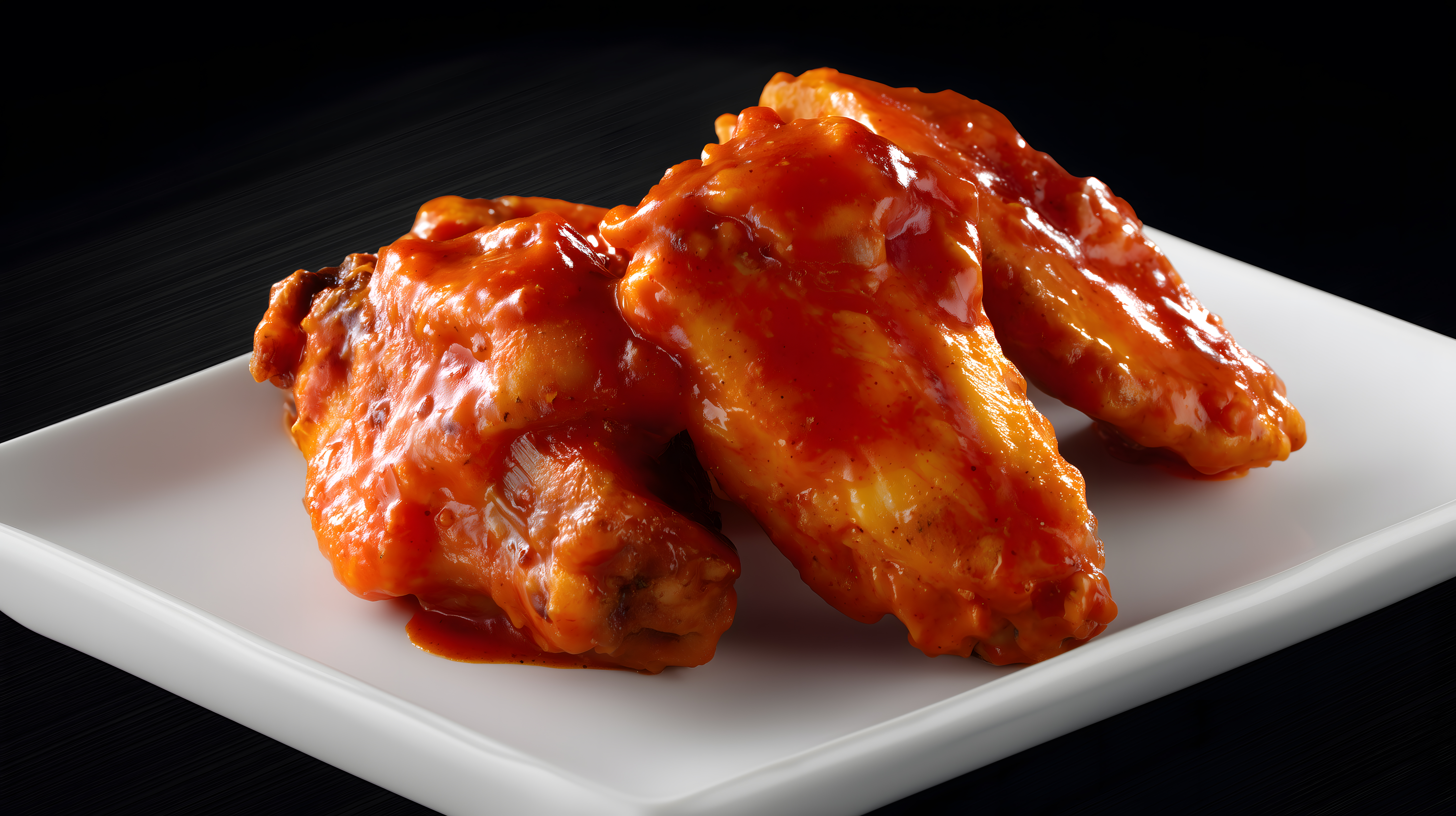Das Bild zeigt eine Nahaufnahme von saftigen Hühnchen-Flügeln, die in einer würzigen, roten Barbecue-Sauce getränkt sind. Die Flügel liegen auf einer weißen, schlichten Platte vor einem dunklen Hintergrund, was einen starken Kontrast und ästhetische Wirkung erzeugt. Das Foto besticht durch seine rustikale Anmutung und appetitliche Präsentation des Gerichts. Dieses hochauflösende Stockfoto eignet sich hervorragend für die Verwendung in Blogs, Newslettern, Social-Media-Kanälen oder Werbematerialien zum Thema Kochen, Kulinarik und Genuss. Es steht unter der Creative-Commons-Lizenz zur freien Nutzung zur Verfügung.