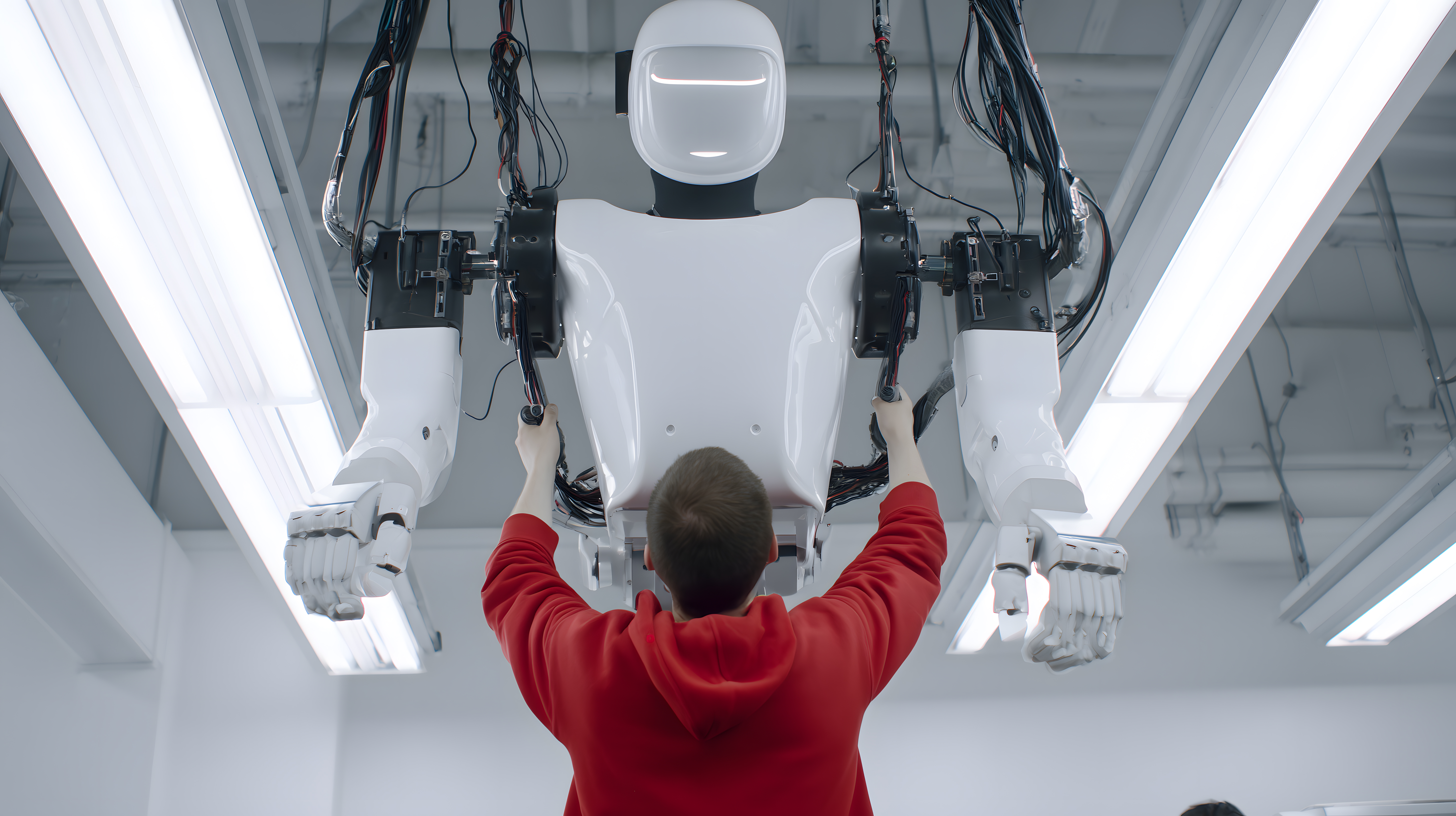 Das Foto zeigt einen Techniker oder Ingenieur, der einen modernen, humanoiden Roboterarm in einer hellen, modernen Werkstatt montiert. Der Roboter ist weiß und hat zwei bewegliche Arme, die von verschiedenen Kabeln und Verbindungen umgeben sind. Der Monteur trägt einen roten Pullover und steht konzentriert vor dem Roboter, um die Montage vorzunehmen. Das Bild vermittelt einen Eindruck von Hightech, Innovation und Automatisierung in der Industrie. Es eignet sich hervorragend als kostenloses Stockfoto für Berichte, Artikel oder Social-Media-Beiträge rund um die Themen Robotik, Technik und Industrie 4.0 in hoher Qualität und Auflösung unter einer Creative-Commons-Lizenz.