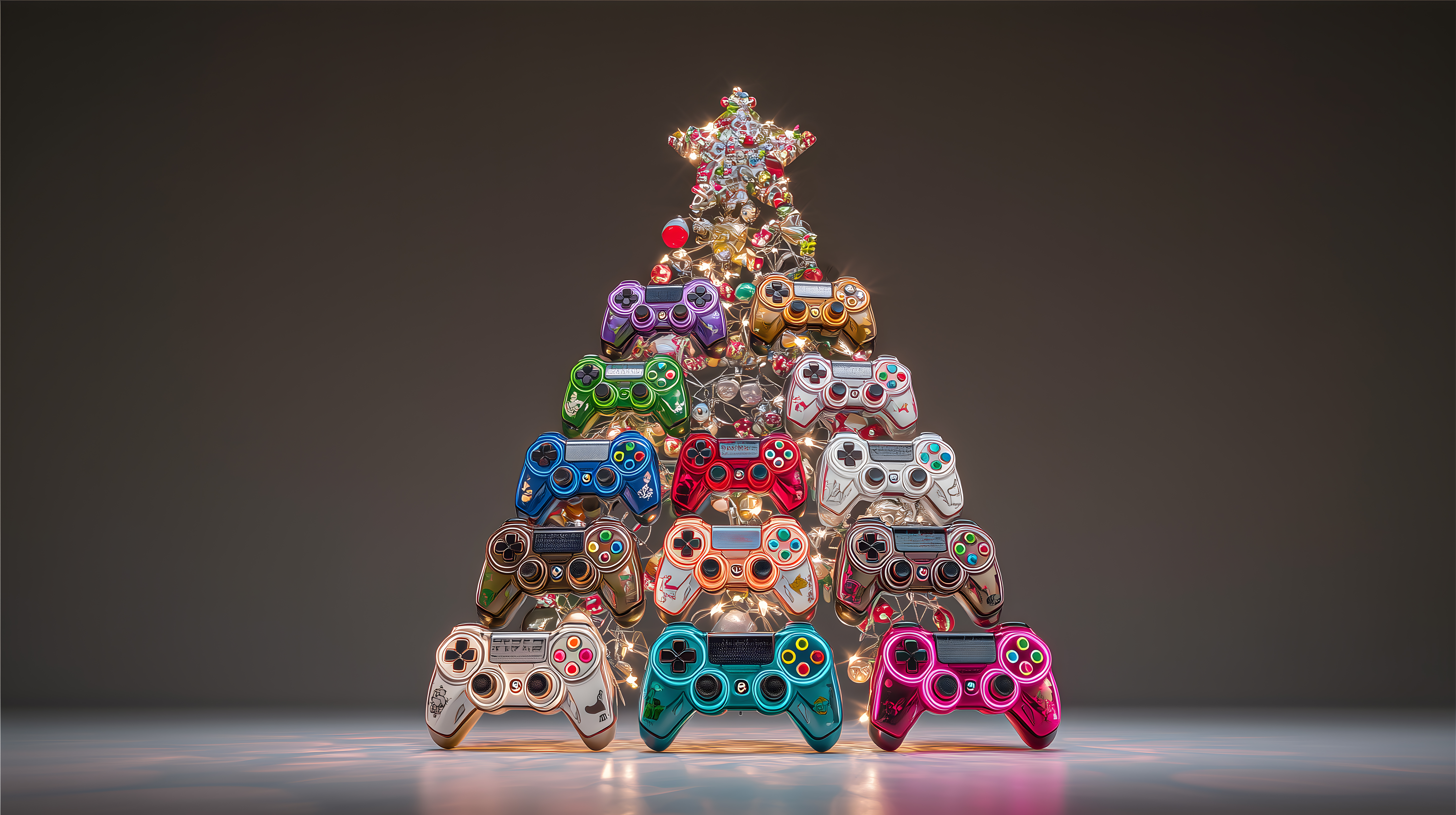 Dieses faszinierende Bild zeigt eine bunte Komposition aus verschiedenen bunten Gamecontrollern, die einen Weihnachtsbaum bilden. Die Gamepad-Modelle in unterschiedlichen Farben wie Rot, Blau, Grün und Lila sind kunstvoll übereinander angeordnet und mit einer hellen LED-Beleuchtung versehen, die den Eindruck einer festlichen Weihnachtsdekoration erweckt. Das Bild strahlt eine kreative, technologieaffine und farbenfroh-spielerische Atmosphäre aus und eignet sich hervorragend als kostenloses Hochauflösungsfoto für Blogs, Social-Media-Kanäle, Werbung und andere digitale Veröffentlichungen unter der Creative-Commons-Lizenz.