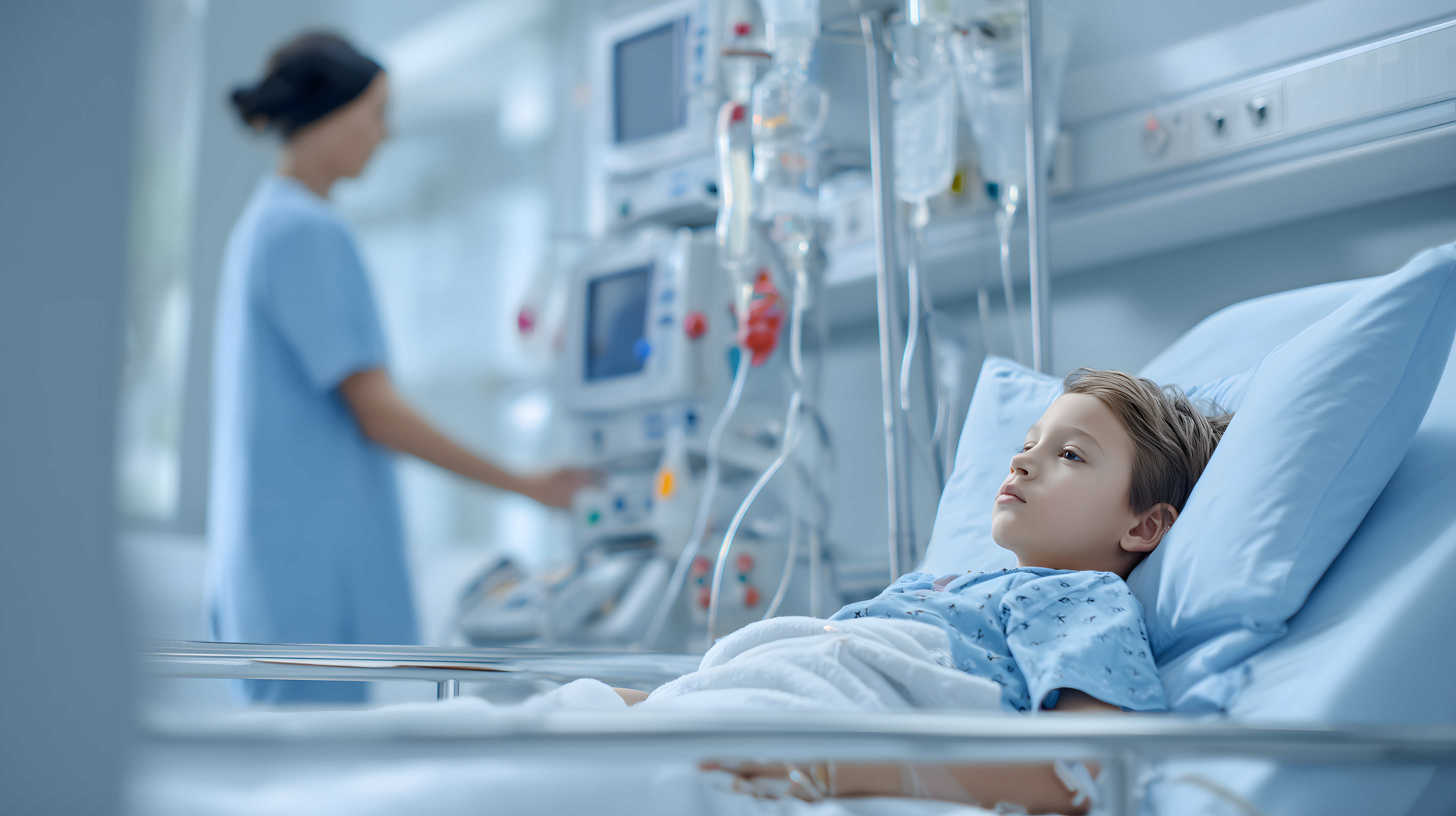 Das Bild zeigt einen jungen Patienten, der in einem Krankenhausbett liegt und mit Infusionen und Überwachungsgeräten verbunden ist. Der Raum ist mit medizinischer Ausstattung ausgestattet, was auf einen Krankenhausaufenthalt hindeutet. Die Szenerie vermittelt einen ernsten, aber auch hoffnungsvollen Eindruck, da der Junge Zuwendung und Fürsorge vom medizinischen Personal erhält. Dieses Stockfoto könnte für Themen wie Gesundheitswesen, Kinderkrankheiten, Heilung und medizinische Behandlung verwendet werden. Es ist in hoher Auflösung verfügbar und unter einer Creative-Commons-Lizenz nutzbar.