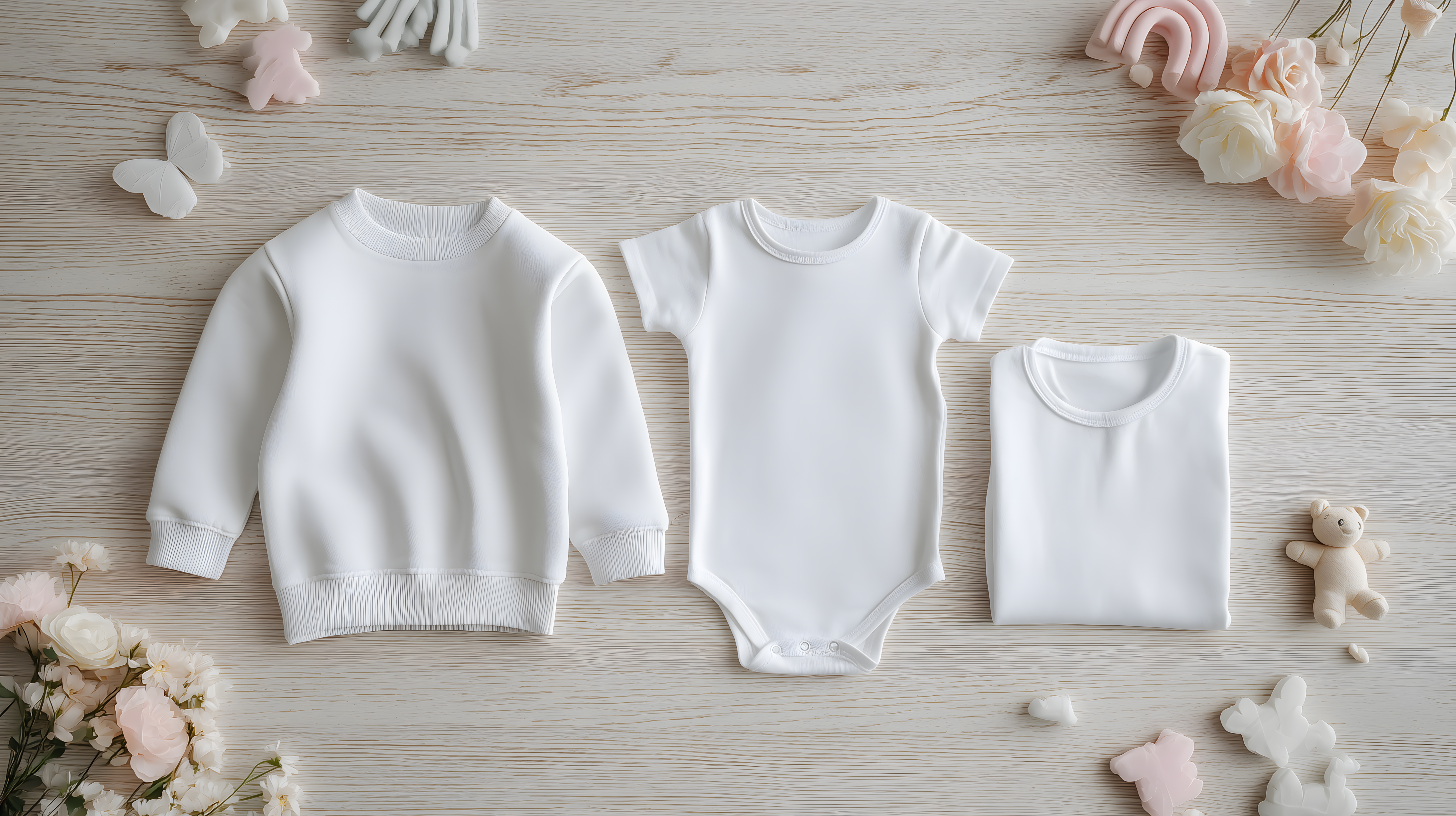 Dieses Bild zeigt eine Flatlay-Aufnahme von verschiedener Babybekleidung und -accessoires auf einem hellen Holzuntergrund. Im Vordergrund sehen wir einen weißen Babybody, ein weißes Sweatshirt und ein weiteres weißes Baby-Oberteil. Um diese herum sind liebevoll platzierte Dekorationselemente wie Blumen in Pastelltönen, eine kleine Plüschpuppe und weitere dekorative Details. Die Komposition ist stimmungsvoll und lädt dazu ein, sich näher mit der Thematik Babyausstattung und Mutterschaft auseinanderzusetzen. Das Bild eignet sich hervorragend für den Einsatz in Blogs, Newslettern, Social-Media-Kanälen oder für Werbezwecke rund um Baby- und Kindermode. Als hochwertiges, kostenfreies Stockfoto unter einer Creative-Commons-Lizenz lässt es sich flexibel und rechtssicher in vielen Kontexten nutzen.