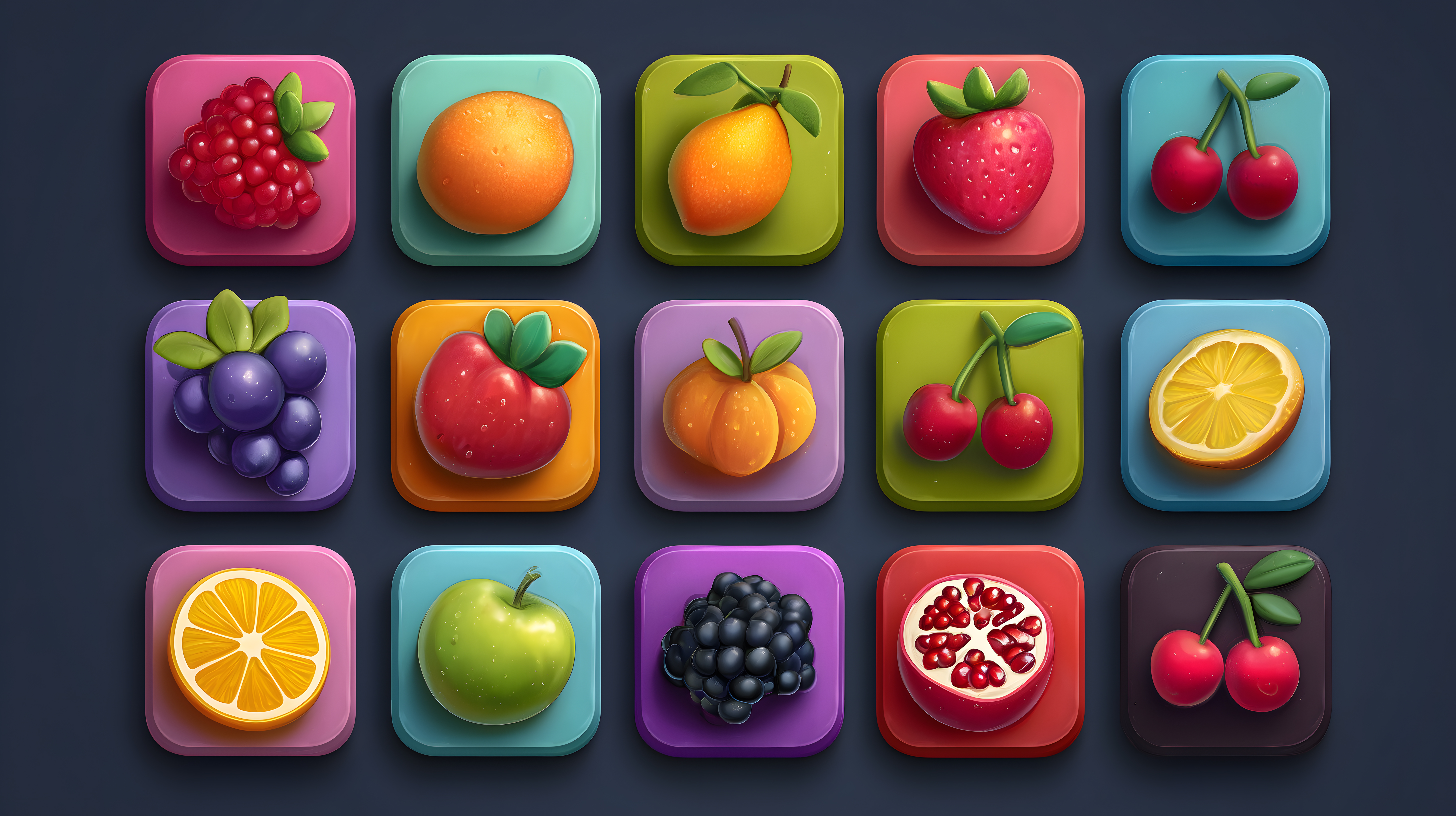 Dieses Foto zeigt eine Reihe von quadratischen Icons, die verschiedene frische Früchte wie Erdbeeren, Äpfel, Zitronen und Trauben darstellen. Die Icons sind in einer lebendigen Farbpalette gehalten und mit detaillierten Blättern und Stielen versehen, was einen natürlichen und organischen Look verleiht. Diese Illustration eignet sich hervorragend für den Einsatz in kreativen Designs, wie zum Beispiel in Spielen, Werbematerialien oder Webseiten. Das hochauflösende Stockfoto ist unter einer Creative-Commons-Lizenz verfügbar und kann somit kostenfrei für eine Vielzahl an Projekten verwendet werden.