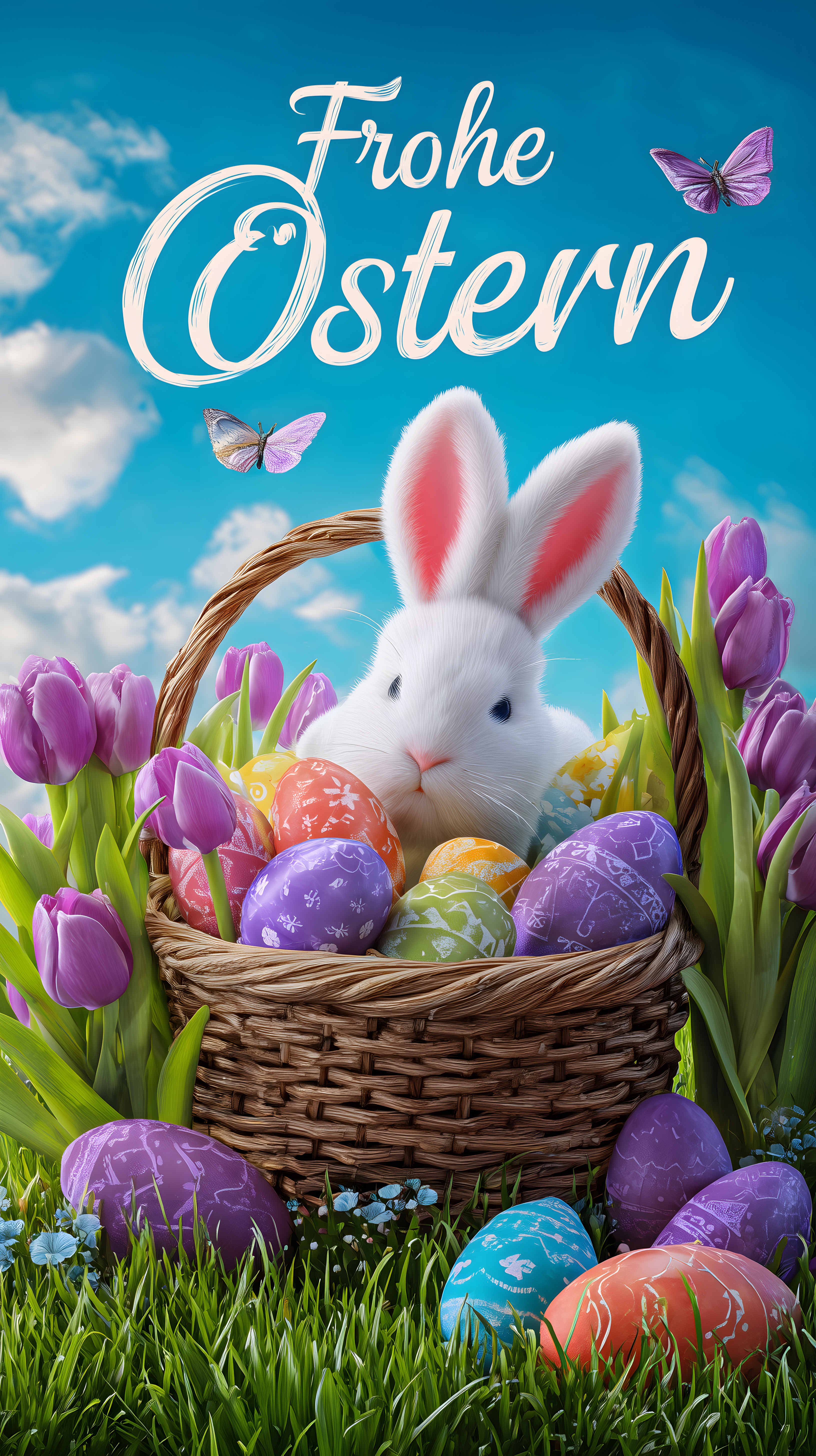 Dieses Foto zeigt einen üppig gefüllten Osterkorb mit einem weißen Hasen und bunten, bemalten Eiern auf einer Wiese. Im Hintergrund sind blaue Wolken am Himmel und lila Tulpen zu sehen, die den Frühling symbolisieren. Das Bild ist perfekt geeignet für Oster-Grußkarten, Werbematerial oder Dekorationen in Sozialen Medien rund um das Osterfest. Das hochauflösende, kostenlose Stockfoto steht unter einer Creative-Commons-Lizenz zur Verfügung.