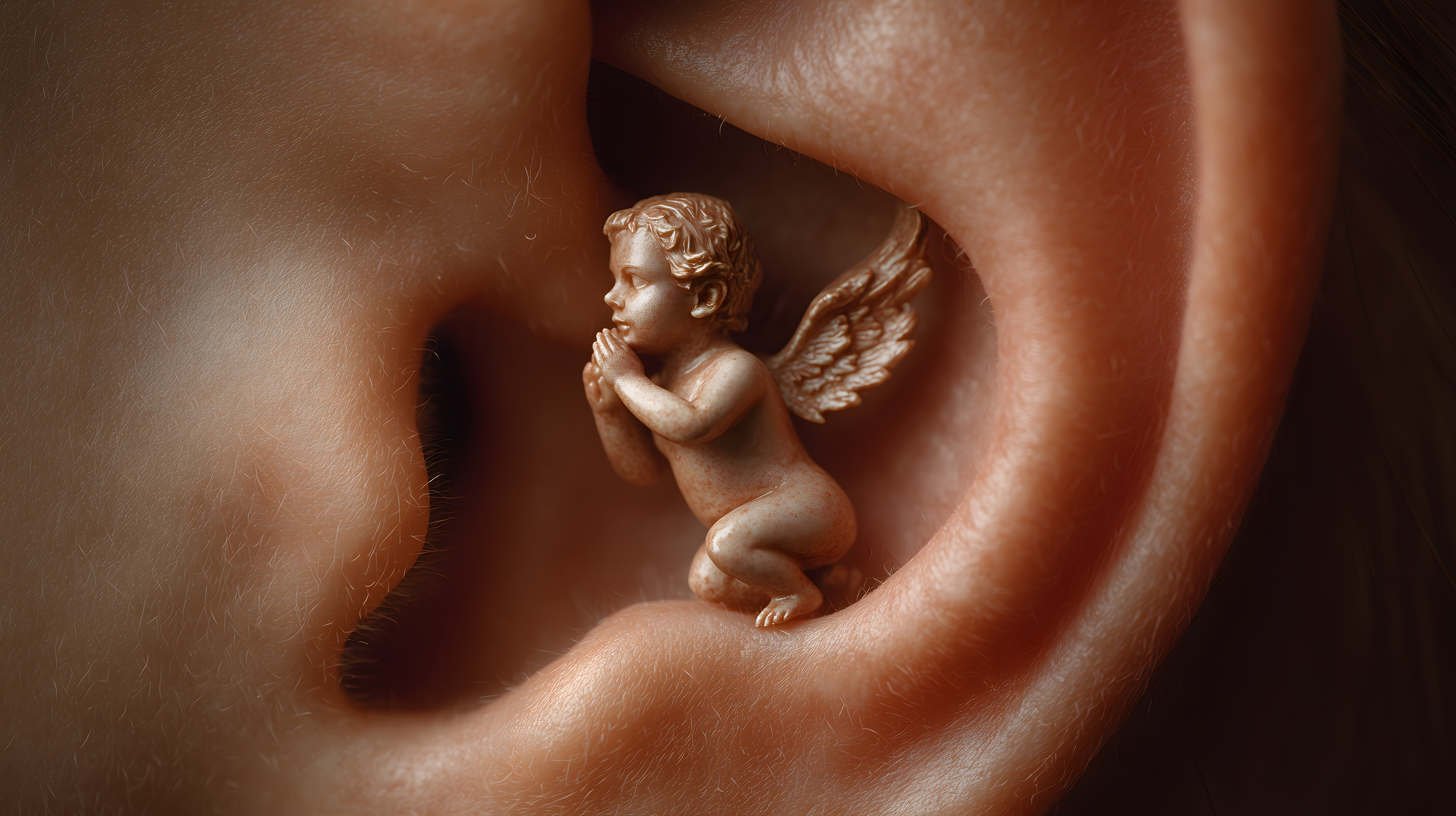 Das Bild zeigt eine detaillierte Nahaufnahme einer Engelsfigur, die in einem menschlichen Ohrkanal platziert ist. Die Engelsfigur ist aus einem hellen, cremefarbenen Material gefertigt und hebt sich durch ihre feine Ausarbeitung von der warmen, braunen Hintergrundstruktur des Ohrs ab. Die Perspektive lässt den Betrachter in das Ohr blicken und verleiht dem Bild eine besinnliche, fast mystische Stimmung.