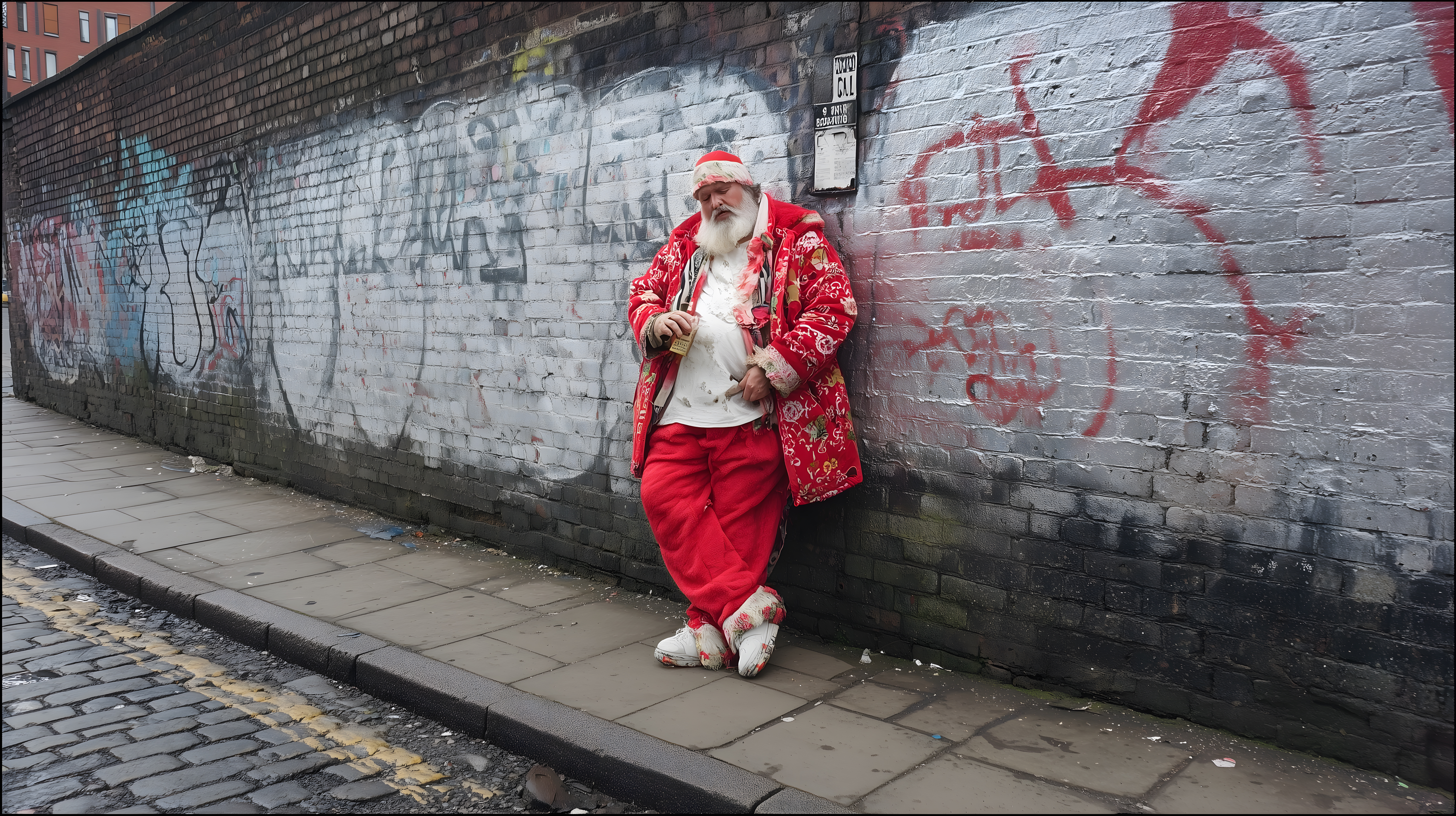 Das Bild zeigt einen in roter Weihnachtsmannkluft gekleideten Mann, der an einer Graffitiwand posiert. Er trägt einen langen, roten Mantel mit Pelzbesatz, eine rote Hose und eine rote Mütze. Sein weißer Bart verleiht ihm ein authentisches Weihnachtsmannaussehen. Die Umgebung ist von Graffitis und einer Ziegelsteinmauer geprägt, was eine urbane, vintage-artige Stimmung erzeugt. Dieses hochauflösende Stockfoto eignet sich hervorragend für Weihnachtsthemen in Blogs, Newslettern, Social-Media-Kanälen oder Werbematerialien und steht unter einer Creative-Commons-Lizenz zur Verfügung.