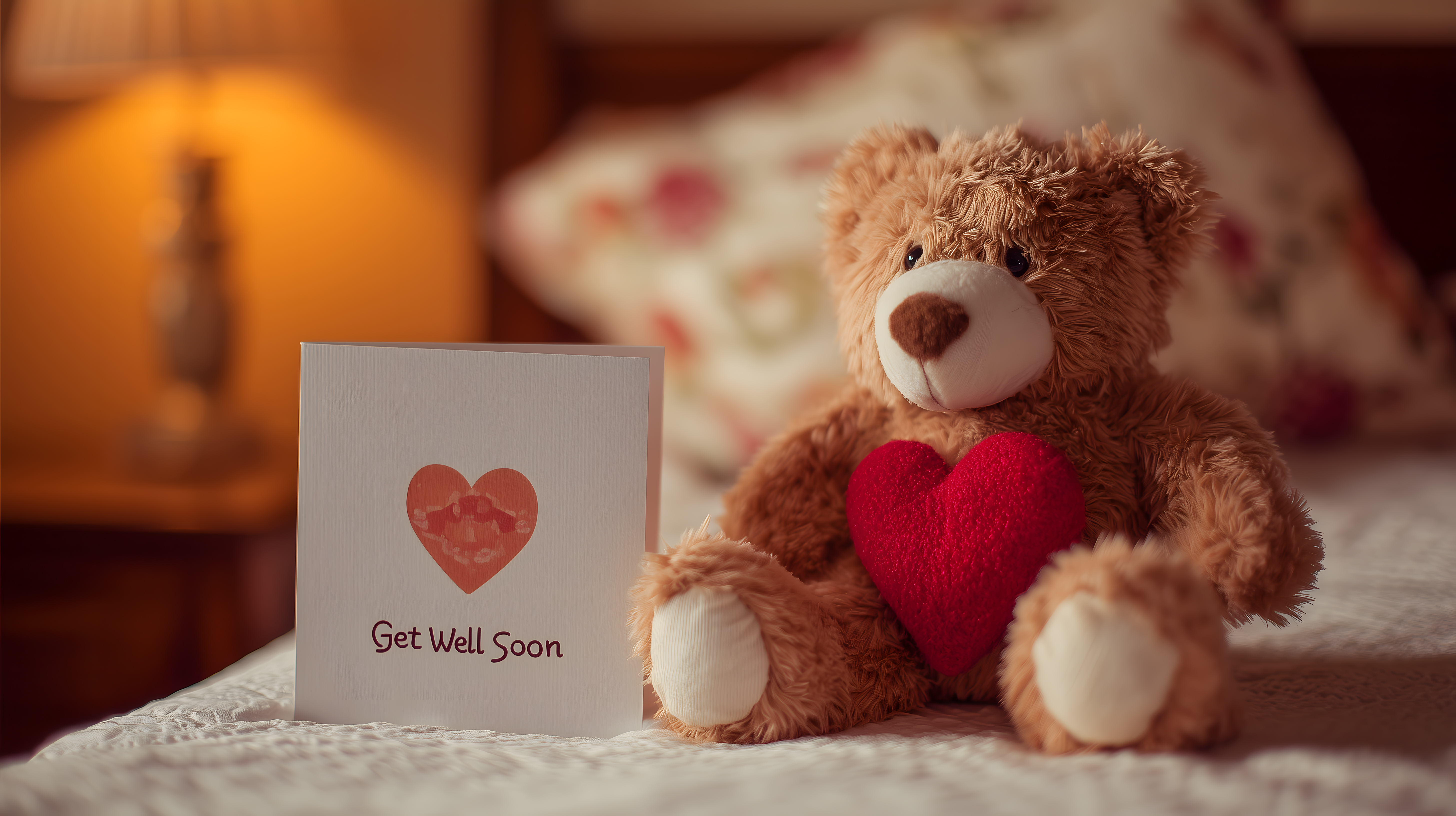 Das Bild zeigt einen braunen Teddybär, der ein rotes Herz in den Armen hält, neben einer Gute-Besserung-Grußkarte auf einer gemütlichen, gesteppten Decke. Die warme, herbstliche Farbgebung und der kuschelige Charakter des Teddys verleihen dem Arrangement eine besondere Atmosphäre der Geborgenheit und Fürsorge. Dieses Stockfoto in hoher Auflösung kann beispielsweise für Blogbeiträge, Newsletter-Designs, Social-Media-Beiträge oder Werbematerial rund um Themen wie Freundschaft, Heilung oder Mitgefühl eingesetzt werden. Es steht unter einer kostenlosen Creative-Commons-Lizenz zur Verfügung.