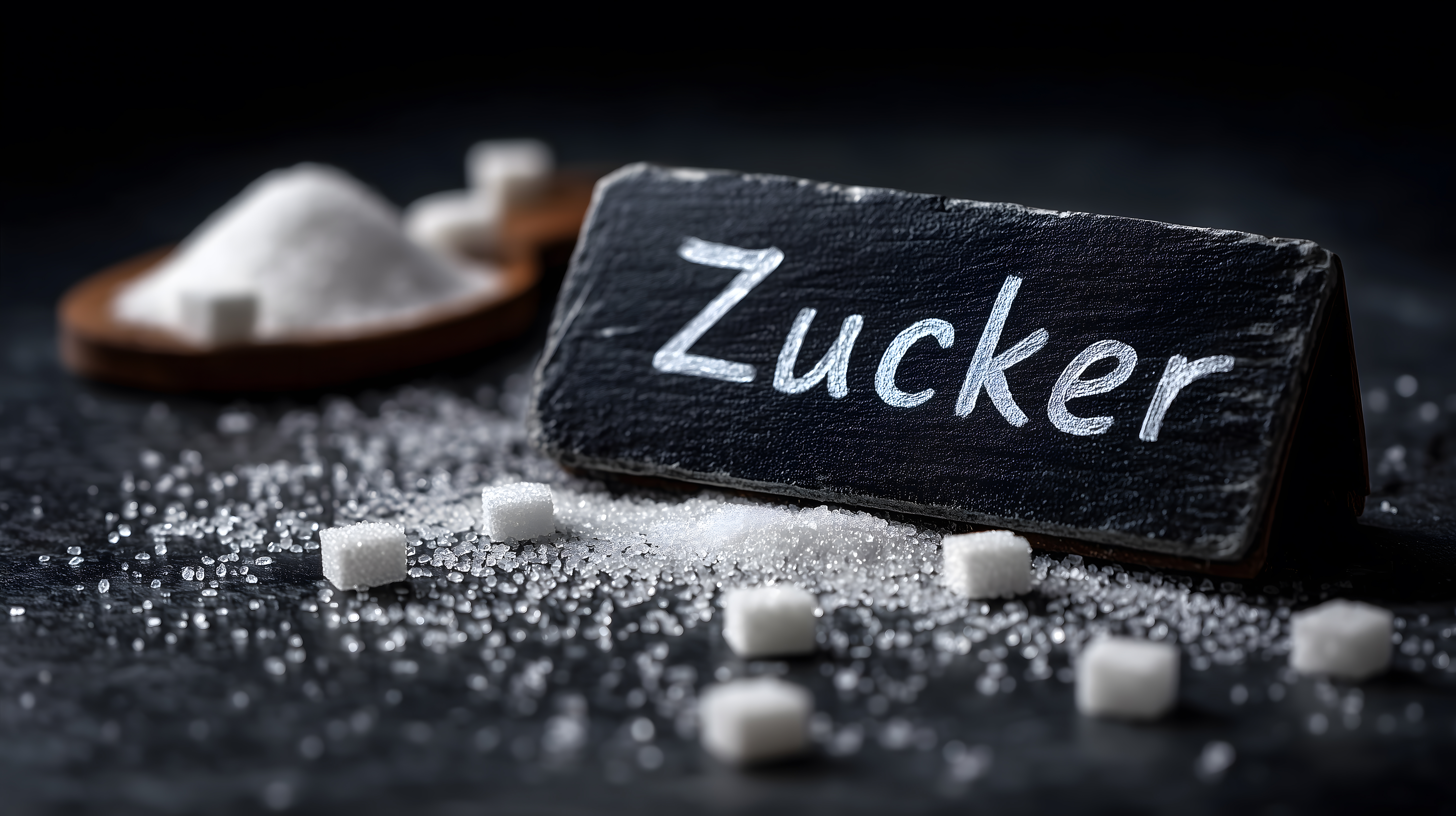 Dieses Foto zeigt eine schwarze Tafel, auf der der Schriftzug 'Zucker' in weißer Kreide geschrieben ist. Rund um die Tafel befinden sich weiße Zuckerkristalle, die in der Schwärze des Hintergrundes kontrastreich hervorstechen. Das Bild strahlt Einfachheit und Minimalismus aus und lässt den Zucker als zentrales Motiv in den Mittelpunkt treten.