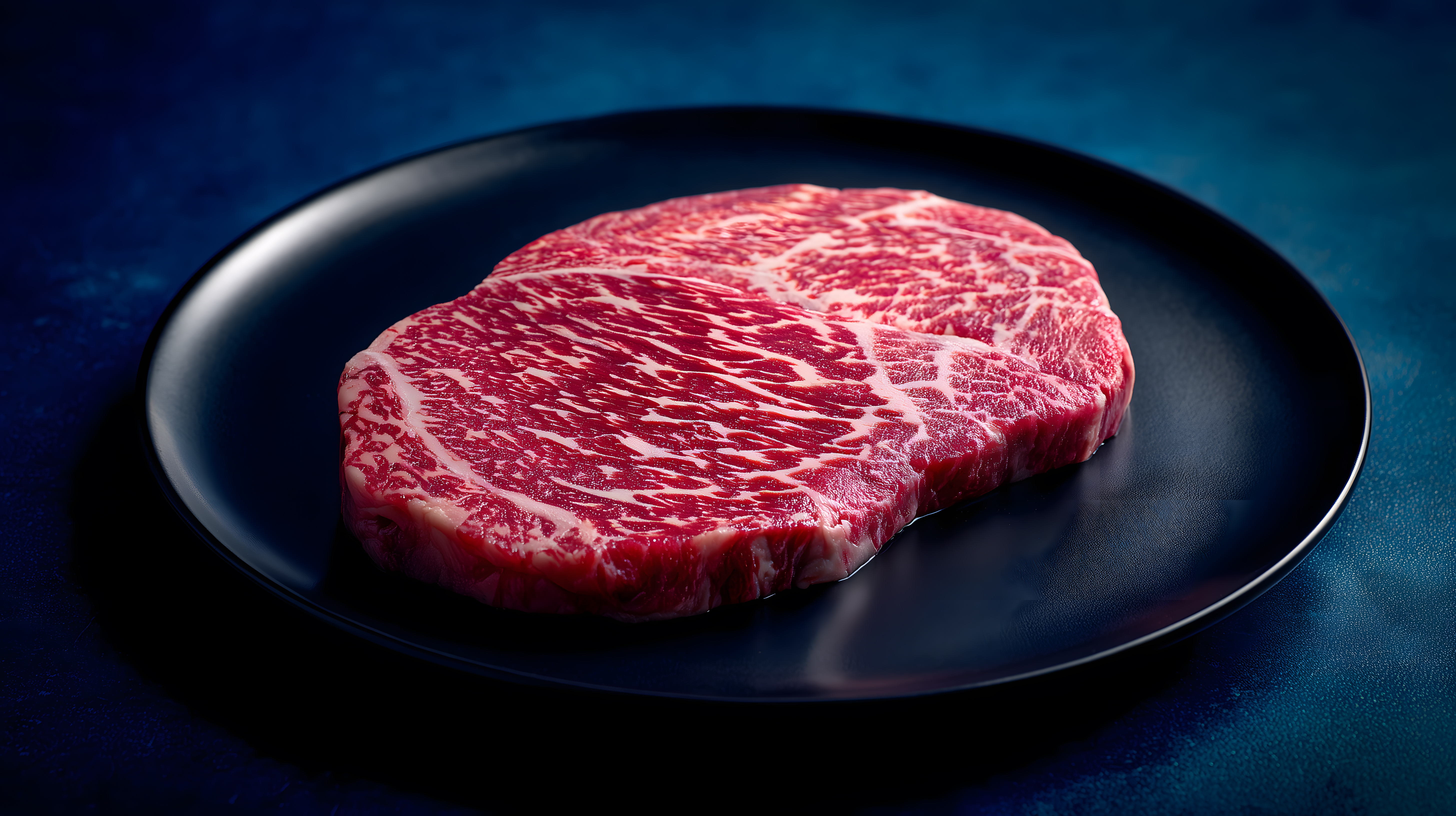 Dieses Foto zeigt eine Nahaufnahme eines saftigen Wagyu-Ribeye-Steaks, das auf einem schwarzen Teller angerichtet ist. Die hochwertige Fleischqualität ist deutlich zu erkennen an der feinen Marmorierung und der intensiv roten Färbung. Der dunkle, blaugetönte Hintergrund lässt das Steak besonders hervortreten und verleiht dem Bild eine elegante, luxuriöse Atmosphäre. Dieses Foto eignet sich hervorragend für den Einsatz in Menüs, Rezeptsammlungen oder Werbekampagnen von Premium-Restaurants und Gourmet-Läden. Es ist als kostenloses Stockfoto in hoher Auflösung und unter einer Creative-Commons-Lizenz verfügbar.