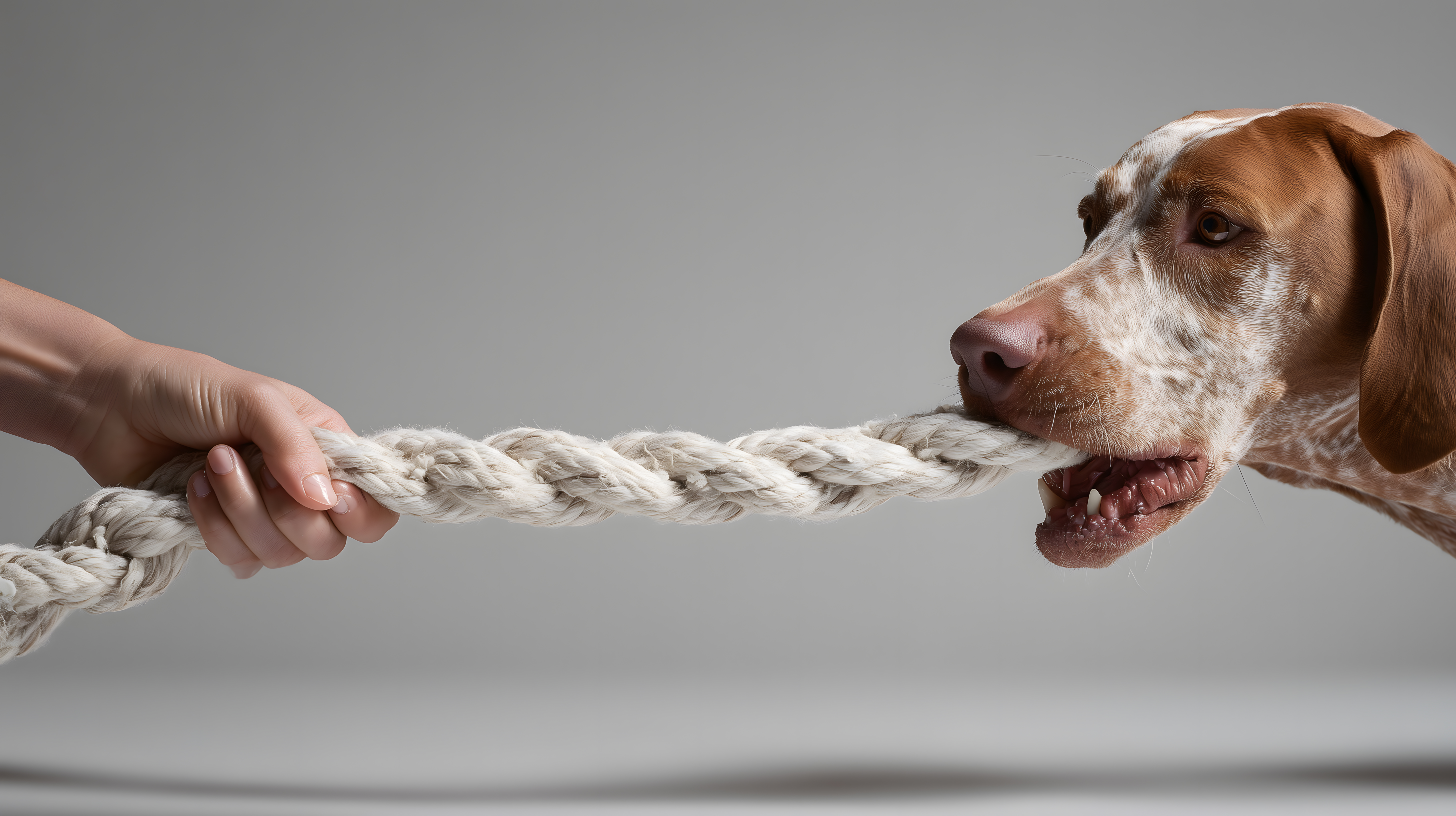 Das Foto zeigt einen Hund, der an einem Seil zieht. Das Bild wurde in einem hellen Studio aufgenommen, der Hintergrund ist grau. Der Hund hat einen beige-braunen, gefleckten Fellton und sieht sehr konzentriert aus, während er mit ganzer Kraft am Seil zerrt. Dieses Stockfoto eignet sich ideal für Artikel, Blogbeiträge oder soziale Medien rund um das Thema Haustiere, Hundesport oder aktive Freizeitgestaltung mit Hunden. Es ist in hoher Auflösung verfügbar und unter einer Creative-Commons-Lizenz nutzbar.