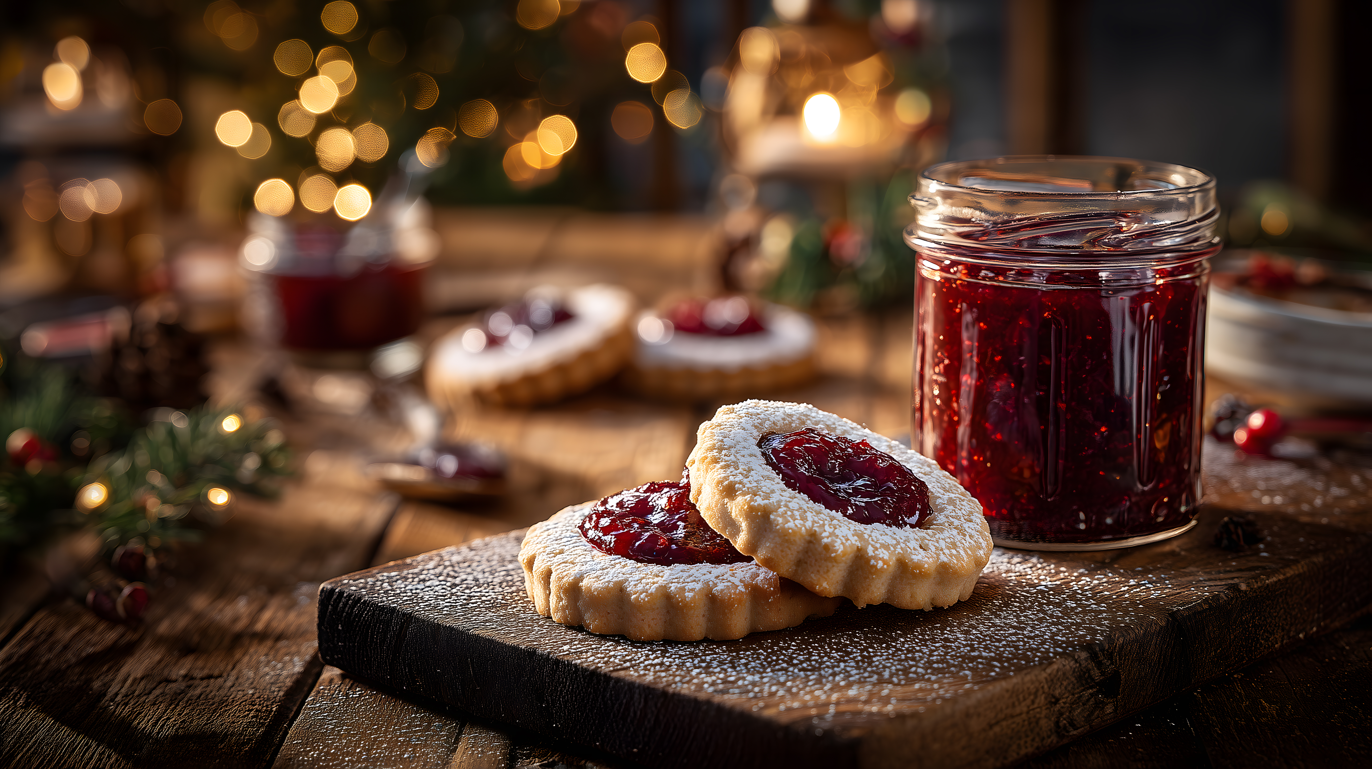 Dieses Foto zeigt leckere Weihnachtsplätzchen, die mit einer roten, fruchtigen Marmeladenfüllung garniert sind. Die Kekse liegen auf einem rustikalen, holzigen Untergrund, umgeben von weihnachtlichen Dekorationen wie Tannenzweigen und Kerzen. Das warme Licht und die weichen Farbtöne von Braun und Rot schaffen eine gemütliche, feierliche Stimmung. Das Bild eignet sich perfekt als Stockfoto für Weihnachtsrezepte, Backblog-Beiträge, Saisonkampagnen oder Feiertags-Werbung. Das hochauflösende Foto steht unter einer Creative-Commons-Lizenz zum kostenlosen Download bereit.