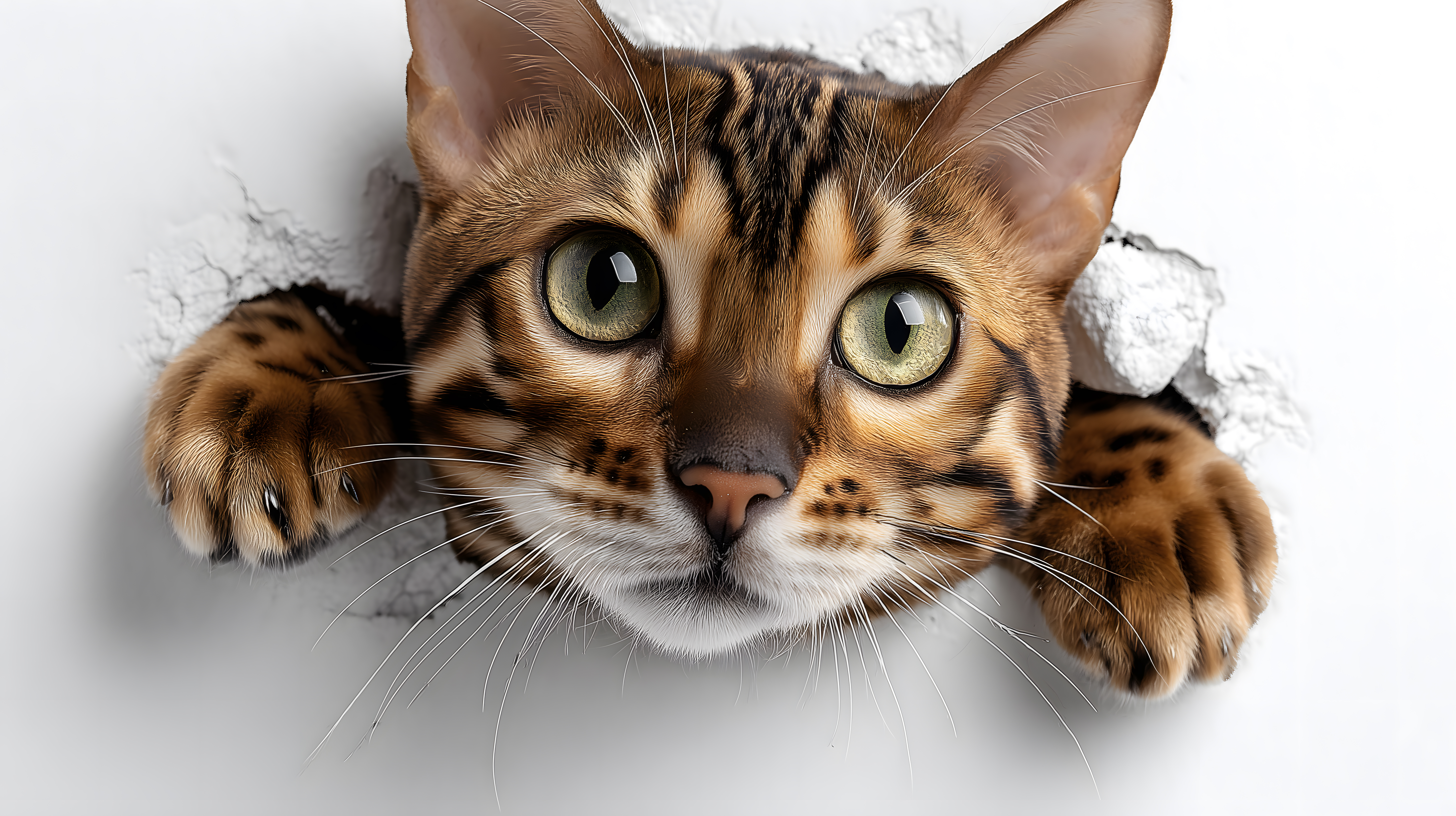 Dieses Foto zeigt den Kopf einer bengalischen Katze, die neugierig durch ein Loch in einer Wand blickt. Das Bild ist in einem natürlichen, warmen Farbton gehalten und konzentriert sich ganz auf den intensiven Blick des Tieres. Die leuchtenden Augen und die gesträubten Schnurrhaare verleihen der Katze einen wachen, lebendigen Ausdruck. Dieses Stockfoto eignet sich hervorragend für Blogbeiträge, Newsletter oder Social-Media-Postings rund um Haustiere, insbesondere Katzen. Es ist in hoher Auflösung verfügbar und steht unter der Creative-Commons-Lizenz zur kostenlosen Nutzung bereit.