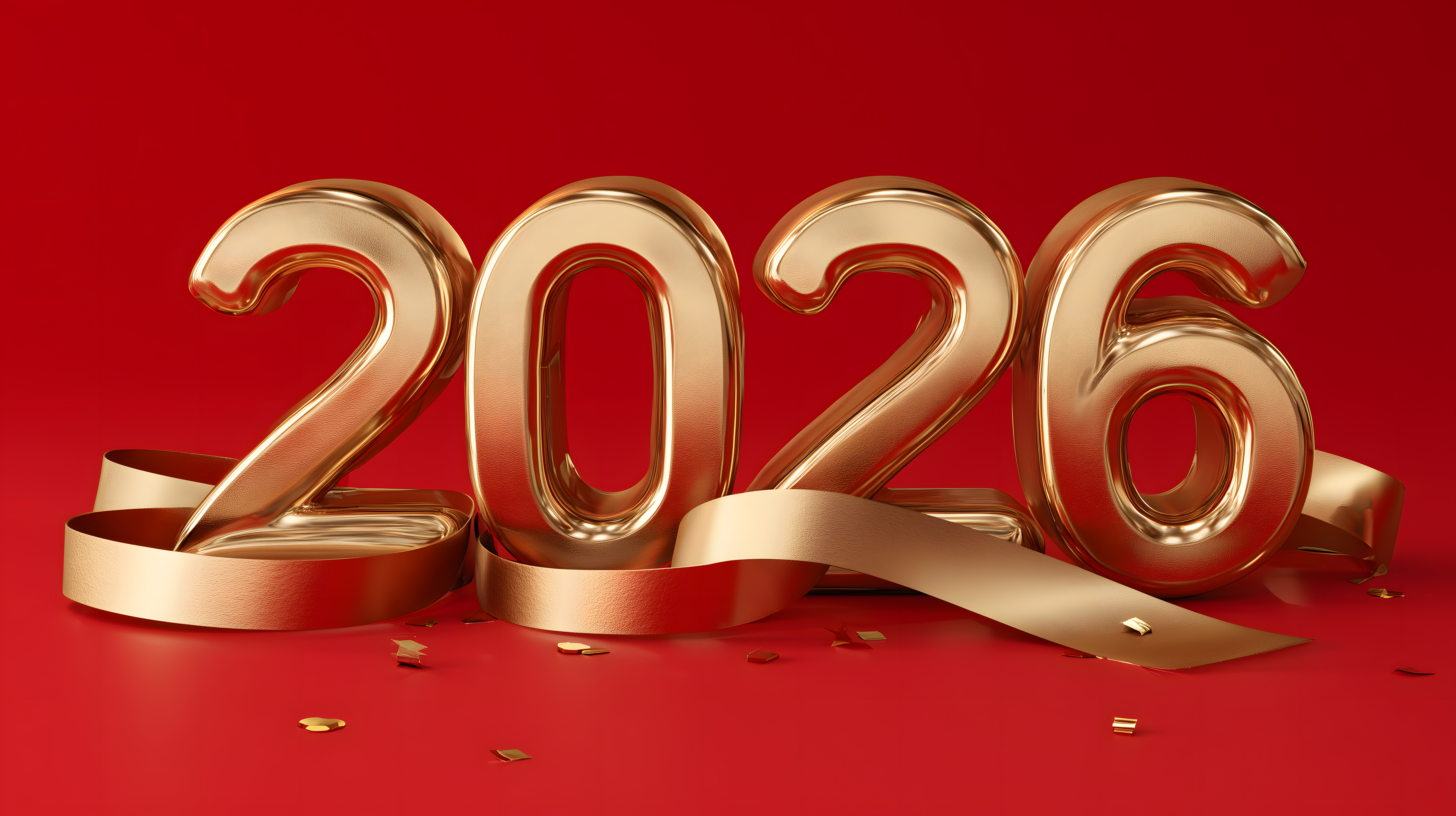 Dieses Stockfoto zeigt einen eleganten und festlichen Hintergrund für das Jahr 2026. Vier goldene, glänzende Zahlen '2026' sind auf einem leuchtend roten Hintergrund platziert. Die Zahlen haben eine luxuriöse, dreidimensionale Optik und verleihen dem Bild eine einzigartige, hochwertige Ausstrahlung.