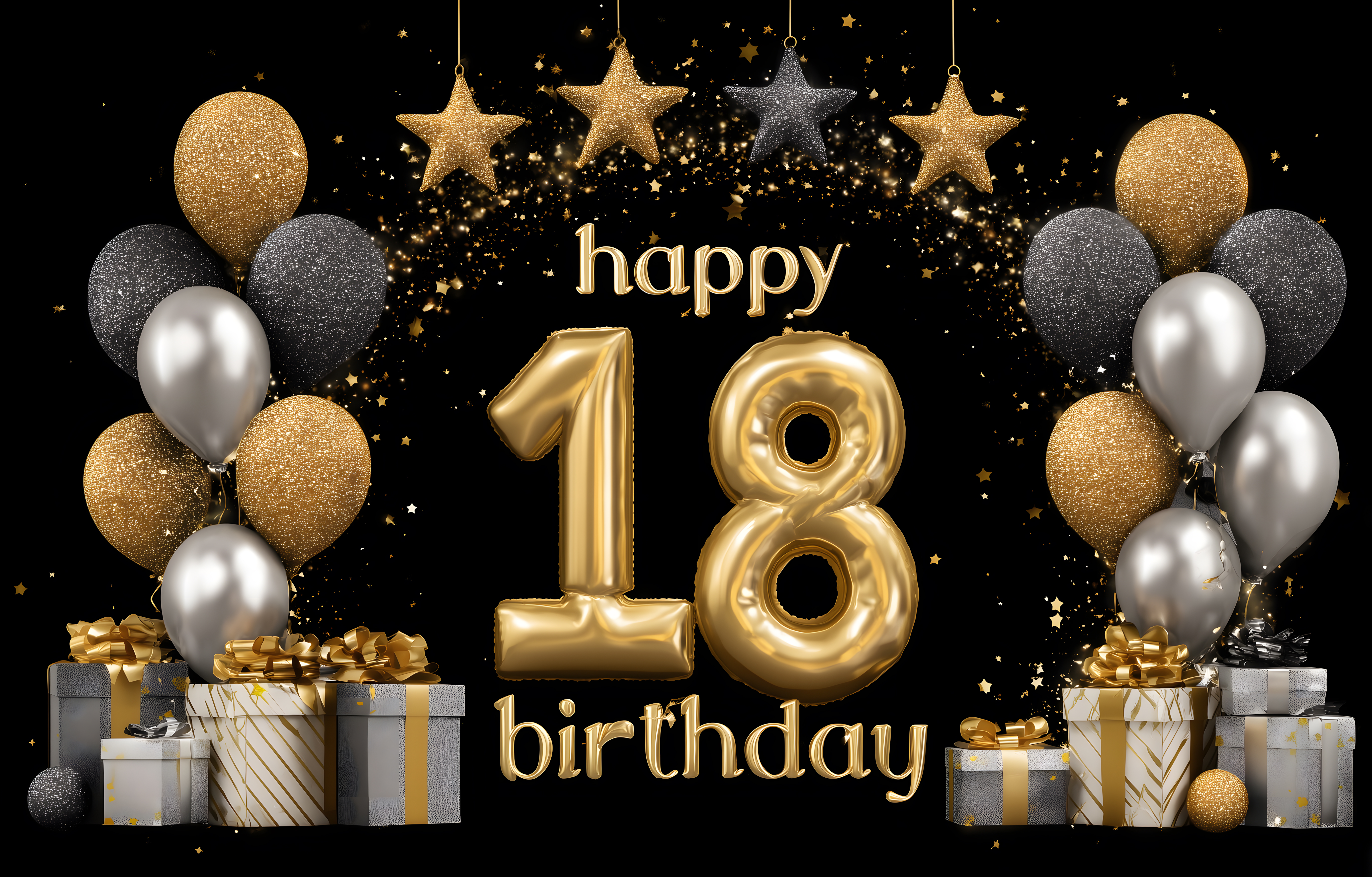 Dieses Stockfoto zeigt eine festliche Deko-Komposition für einen 18. Geburtstag. Im Mittelpunkt stehen goldfarbene aufblasbare Zahlen, die das Alter '18' bilden. Umgeben sind sie von Helium-Ballons in Gold und Silber, glitzernden Sternen und Geschenkboxen. Der dunkle, funkelnde Hintergrund verleiht der Szene einen eleganten und feierlichen Charakter. Diese hochauflösende Aufnahme eignet sich perfekt als kostenloses Stockfoto für Geburtstags-Grußkarten, Social-Media-Beiträge, Newsletter und andere Werbemittel unter Creative-Commons-Lizenz.