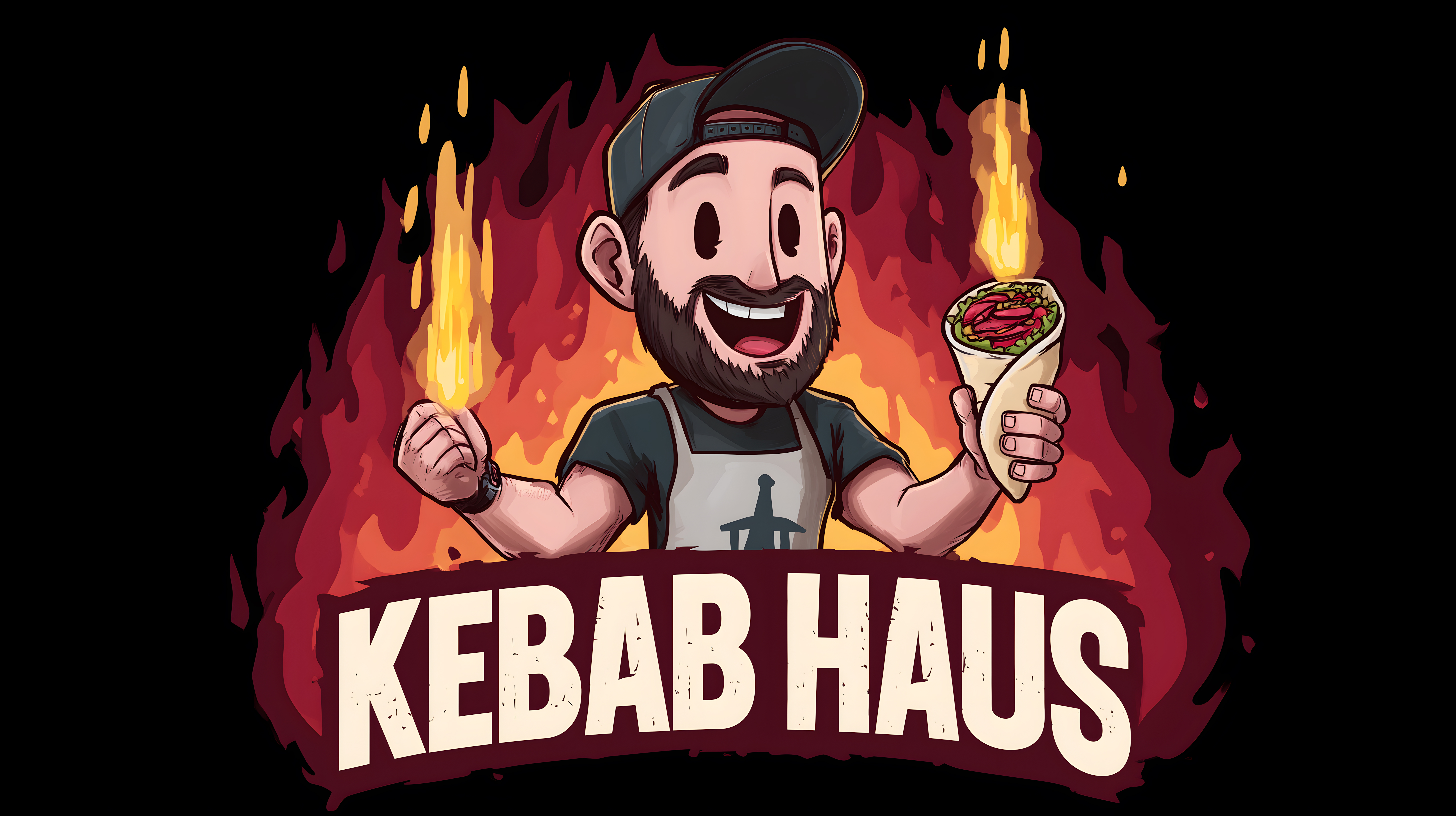 Diese farbenfrohe Cartoon-Illustration zeigt einen lächelnden Koch, der stolz einen frisch zubereiten Dönerkebab in der Hand hält, umgeben von Flammen und dem Logo 'Kebab Haus'. Das Bild strahlt eine lebendige, appetitanregende Atmosphäre aus und eignet sich hervorragend als kostenloses Stockfoto für Blogs, Newsletter, Social-Media-Posts oder Werbematerialien rund um das Thema Fastfood, Gastronomie und leckere Essensangebote. Die hohe Auflösung und die Creative-Commons-Lizenz machen es zu einem flexibel einsetzbaren grafischen Element.