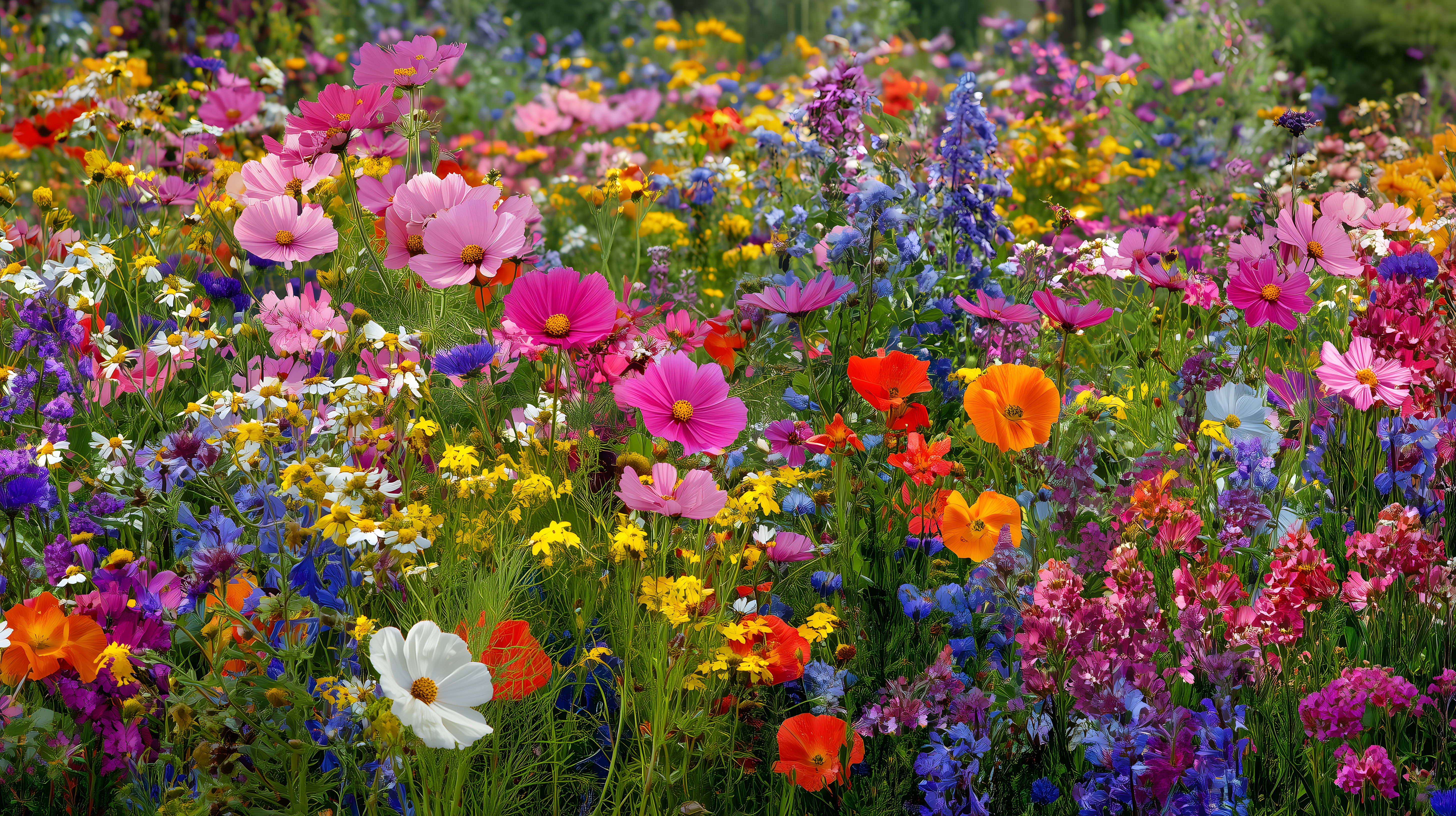 Das Foto zeigt eine üppige Blumenwiese voller blühender Sommerpflanzen in einer natürlichen Landschaft. Die Blumen erstrecken sich über das gesamte Bild und präsentieren eine vielfältige Farbpalette von Pink, Rot, Orange, Gelb, Lila und Blau. Die Komposition ist wild und ungebändigt, mit einer lebendigen Dynamik, die den Betrachter in eine bukolische Sommerstimmung versetzt. Dieses einzigartige Foto eignet sich hervorragend als kostenlose Hintergrundgrafik für Blogs, Newsletter, Social-Media-Beiträge oder Werbematerial. Es ist in hoher Auflösung verfügbar und unter einer Creative-Commons-Lizenz nutzbar.