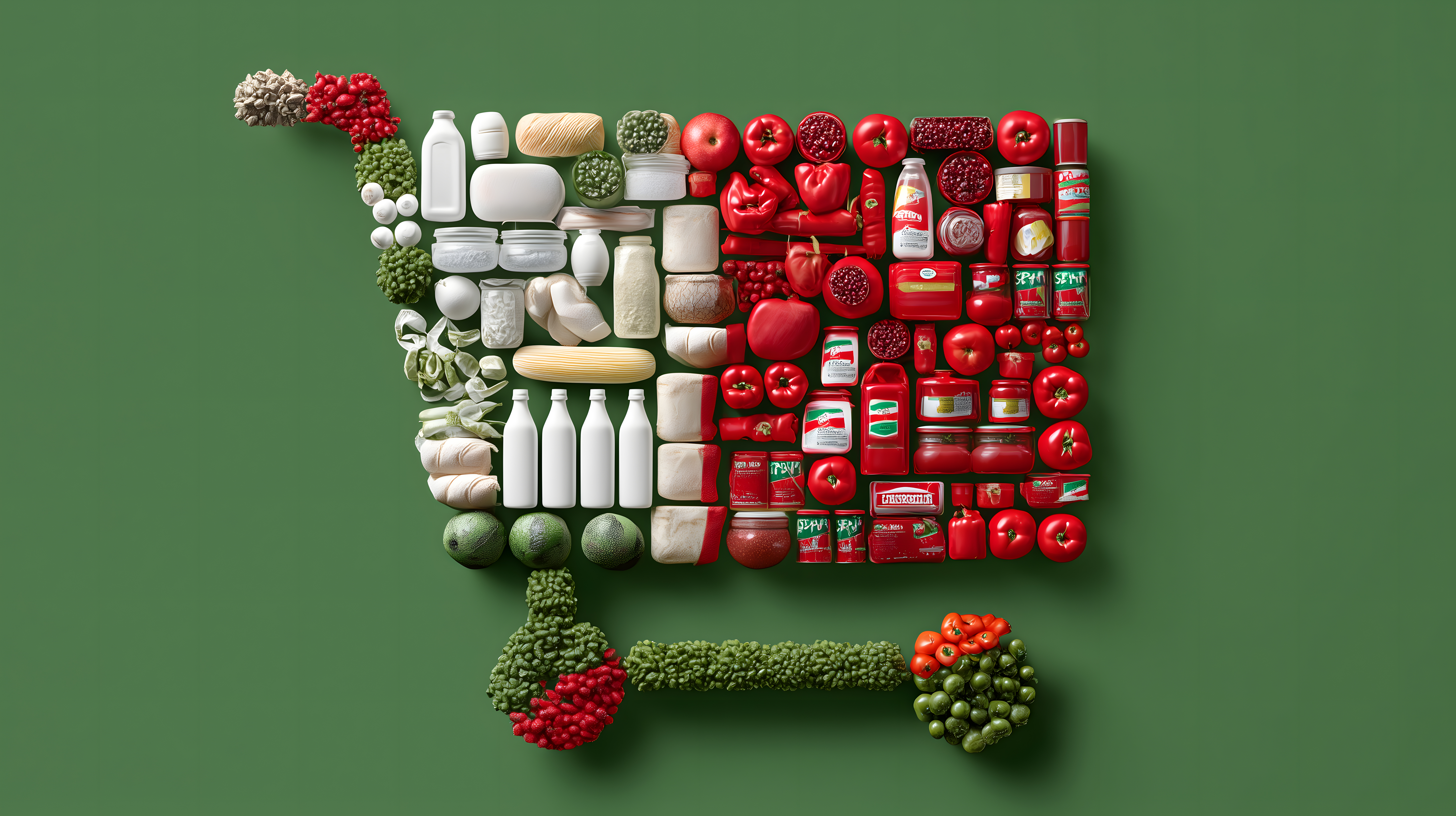 Dieses einzigartige Foto zeigt ein Einkaufswagen-Symbol, das aus einer Vielzahl an frischen Obst- und Gemüsesorten zusammengesetzt ist. Die Anordnung der roten, weißen und grünen Elemente schafft ein stimmungsvolles, minimalistisches Muster auf einem kräftigen grünen Hintergrund. Das Bild vermittelt Frische, Gesundheit und Kreativität und eignet sich hervorragend für den Einsatz in Blogbeiträgen, Werbekampagnen oder Social-Media-Postings rund um die Themen Ernährung, Nachhaltigkeit und Lebensmittel. Dieses hochaufgelöste, kostenlose Stockfoto unter Creative-Commons-Lizenz ist eine einzigartige visuelle Darstellung des Konzepts der gesunden Ernährung.