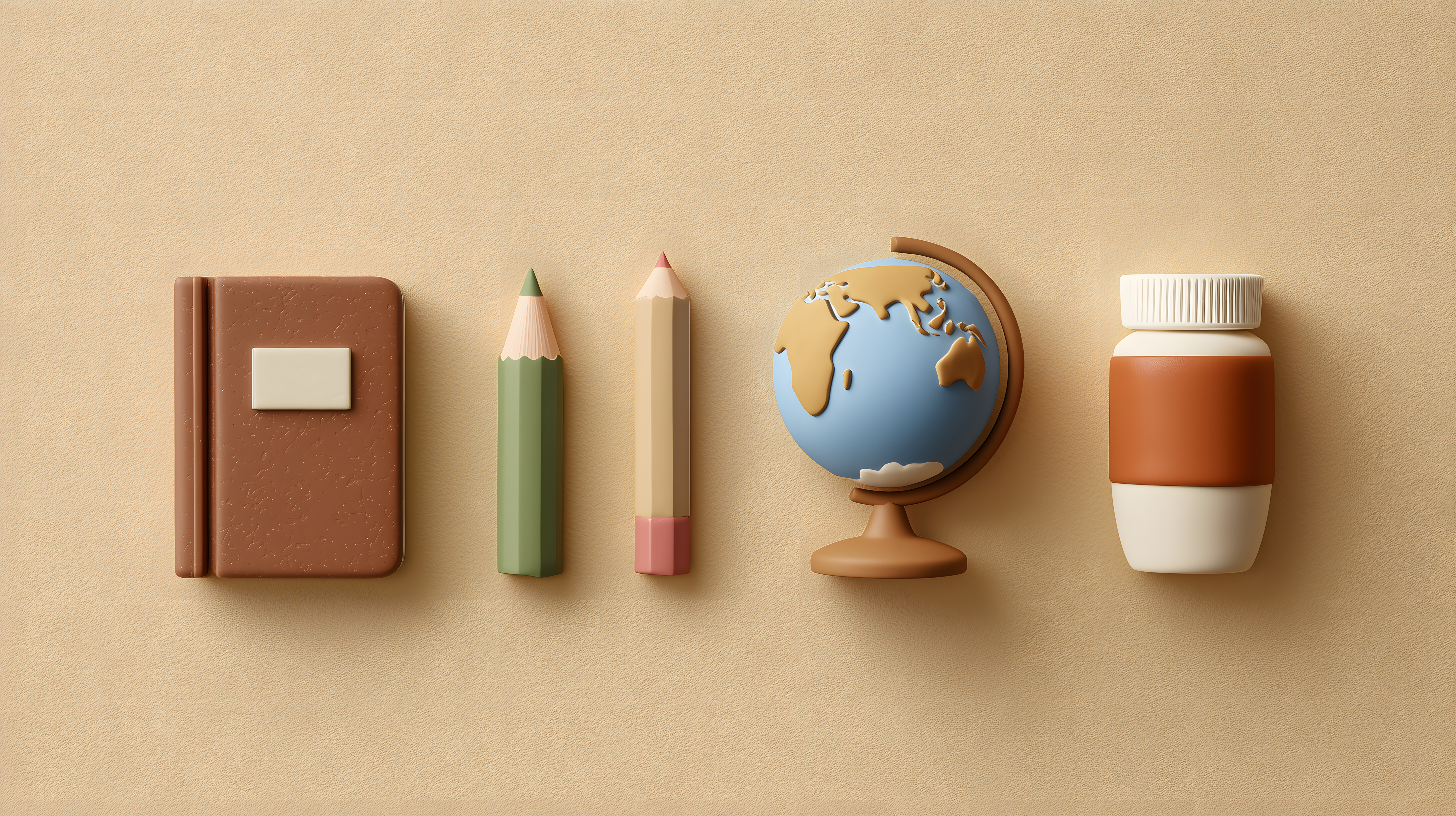 Dieses Bild zeigt eine Zusammenstellung von Schulmaterialien in einem minimalistischen, flachen Design. Es beinhaltet ein braunes Buch, bunte Bleistifte in Grün, Rosa und Braun sowie einen blauen Globus auf einem beigen Hintergrund. Die Anordnung der Objekte ist symmetrisch und lässt den Fokus auf die Materialien selbst zu. Dieses Stockfoto eignet sich hervorragend für Blogs, Newsletter, soziale Medien oder Werbematerialien zum Thema Bildung, Lernen oder Kreativität. Es ist in hoher Auflösung verfügbar und steht unter einer Creative-Commons-Lizenz zur Verfügung.