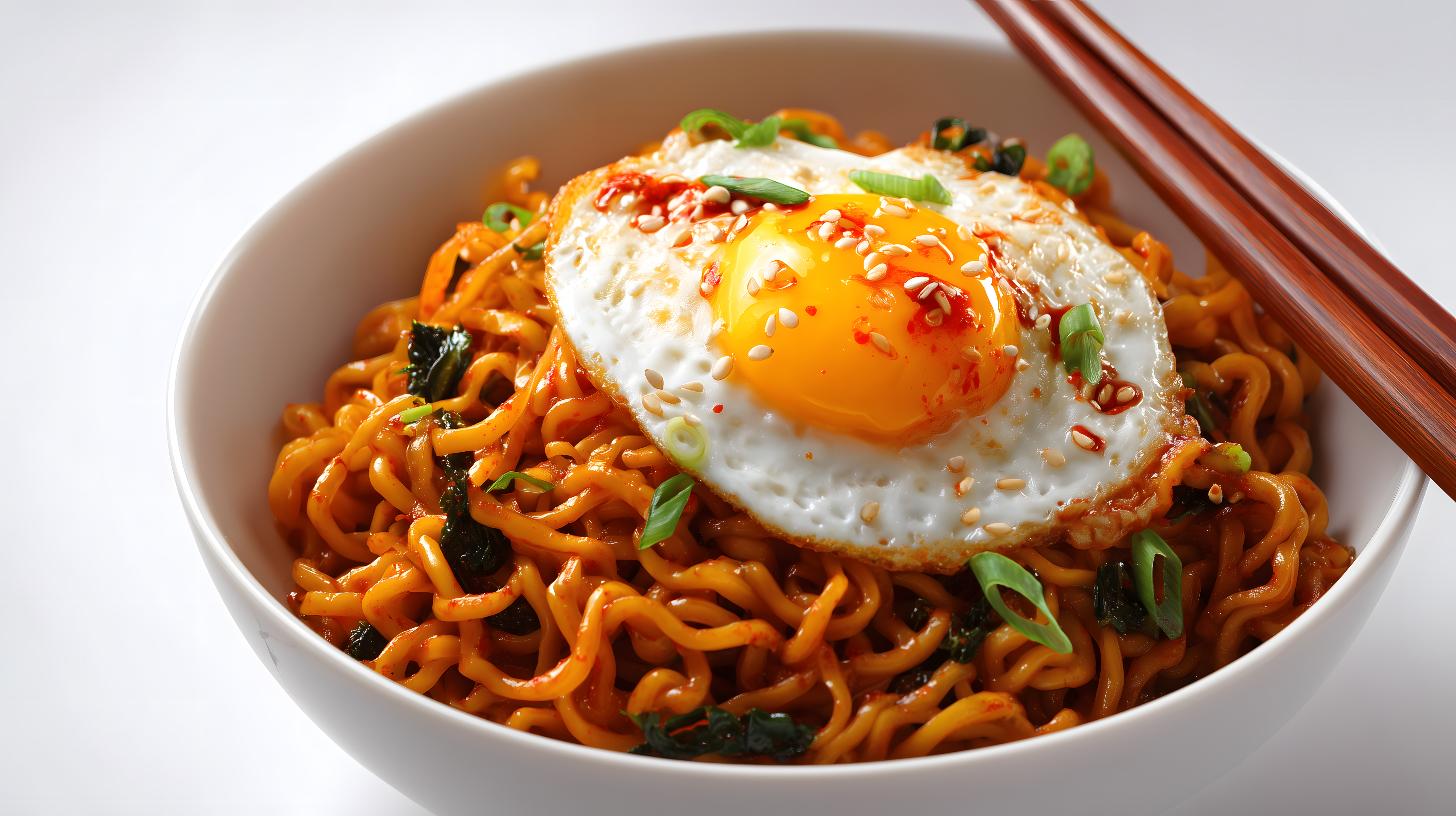 Das Bild zeigt ein appetitliches koreanisches Reisnudel-Gericht in einer weißen Schüssel. Die orangefarbenen, gewellten Nudeln sind mit gewürzter Sauce bedeckt und mit knusprigen Frühlingszwiebeln, Sesamkörnern und einem perfekt gebackenen Spiegelei garniert. Das Gericht besticht durch seine lebendigen Farben, die sorgfältige Anrichtung und den authentischen asiatischen Charakter. Es eignet sich hervorragend als kostenloses Stockfoto für Blogs, Social-Media-Beiträge oder Werbematerialien rund um die asiatische Küche, gesunde Ernährung oder leckere Mahlzeiten in hoher Auflösung unter der Creative-Commons-Lizenz.