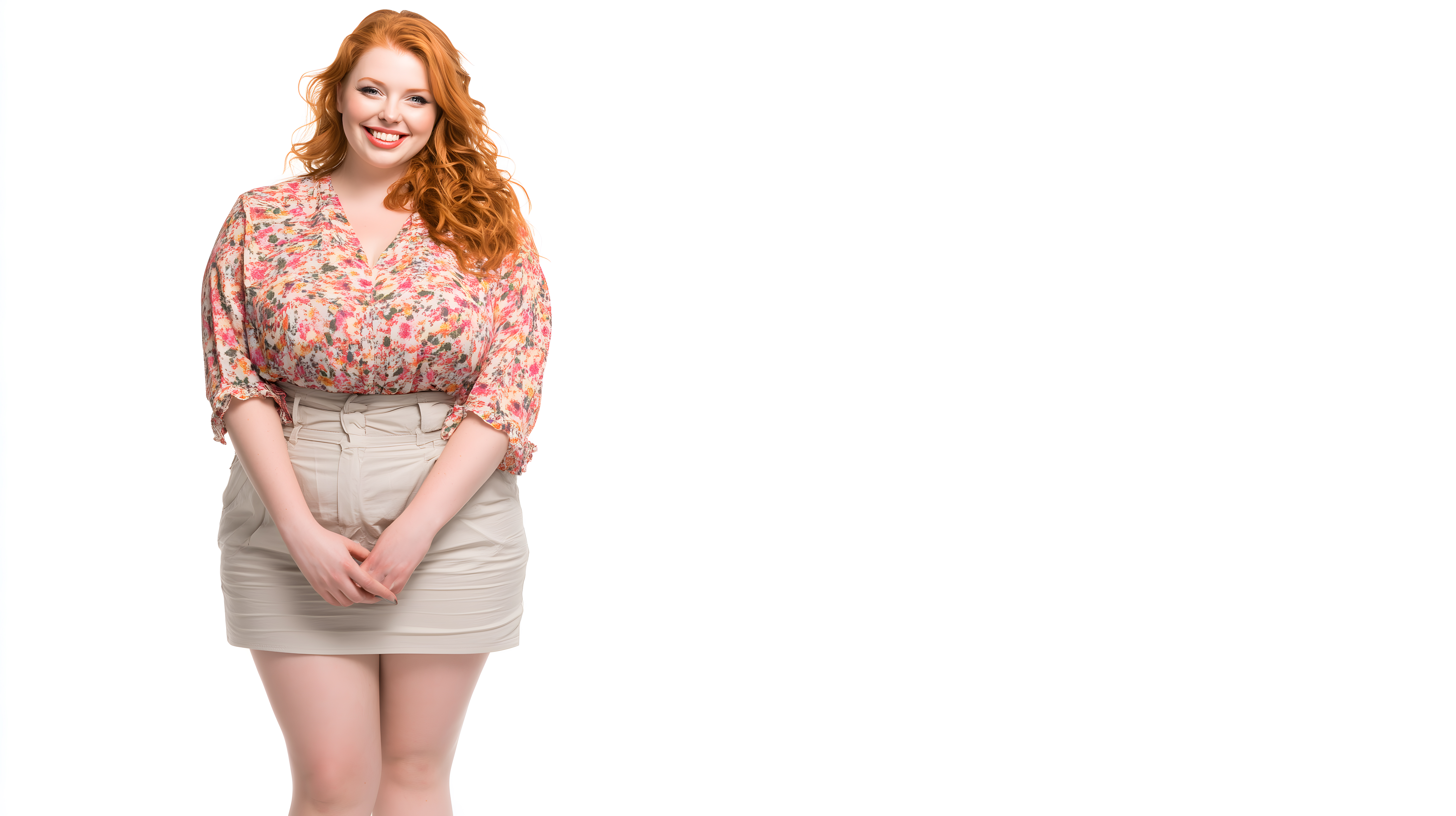 Das Bild zeigt ein selbstbewusstes und lächelndes Curvy-Model mit langen, roten Locken. Sie trägt eine gemusterte, pink-rosa Bluse und beige Shorts. Das Model posiert vor einem weißen Hintergrund, wodurch der Fokus ganz auf ihre positive Ausstrahlung und ihr modisches Outfit gelegt wird. Dieses Foto eignet sich hervorragend für den Einsatz in Mode-Blogs, auf Social-Media-Kanälen sowie für Werbe- und Marketingzwecke, die ein modernes, inklusives Frauenbild vermitteln möchten. Das hochauflösende Stockfoto steht unter einer Creative-Commons-Lizenz kostenlos zum Download bereit.
