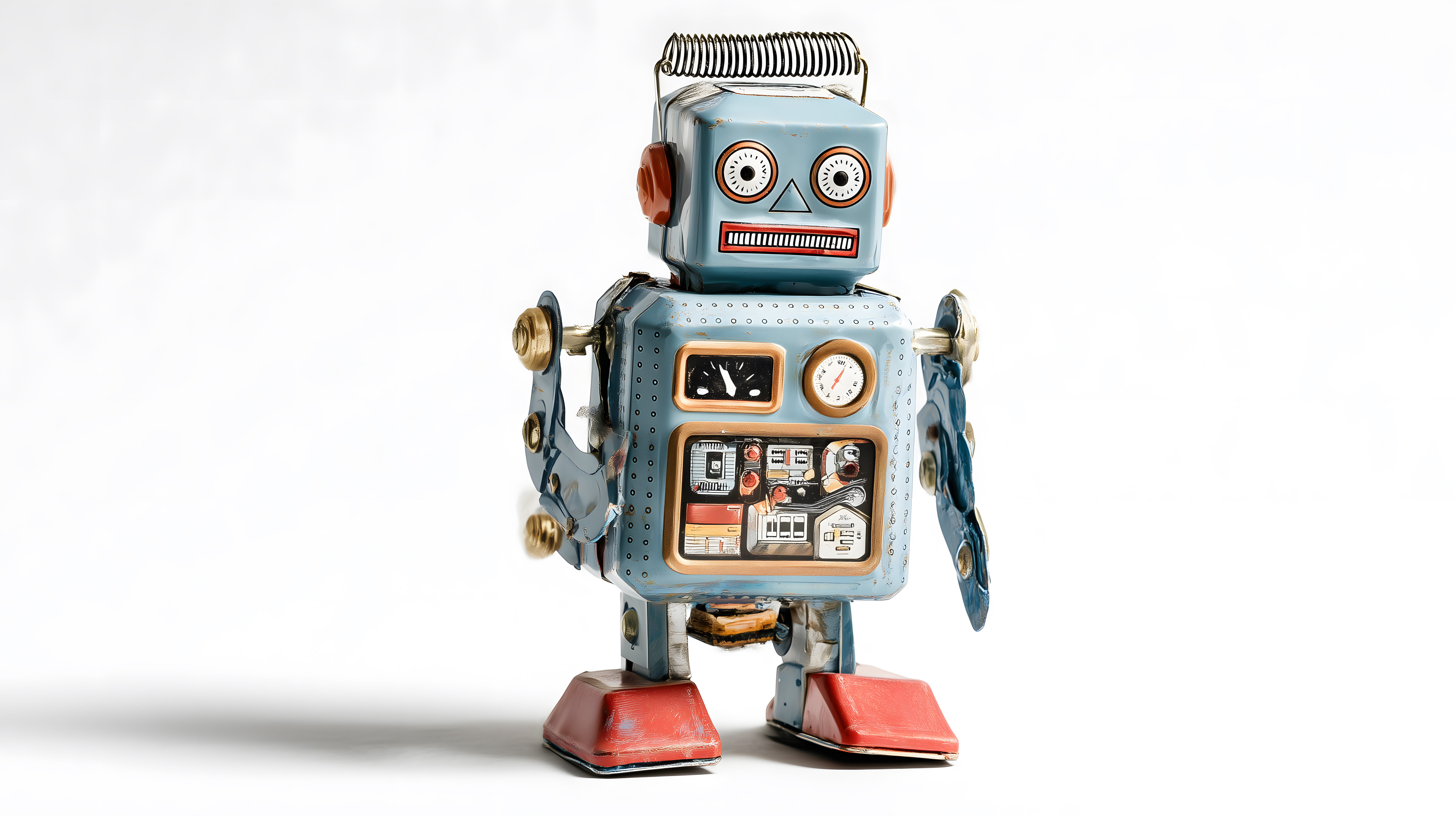 Dieses Bild zeigt ein klassisches Retro-Roboterspielzeug mit einem hübschen, nostalgischen Design. Der Roboter ist in einem hellen Blaugrau gehalten und mit verschiedenen bunten Details, Knöpfen und Instrumenten ausgestattet. Seine großen, schwarzen Augen und das leicht schiefe Lächel verleihen dem Motiv einen charmant-kitschigen Charakter. Dieses Foto eignet sich hervorragend als Eyecatcher für Blog-Beiträge, Newsletter oder Social-Media-Posts zum Thema Technologie, Retro-Design oder Spielzeugkultur. Als kostenloses Stockfoto in hoher Auflösung unter einer Creative-Commons-Lizenz kann es vielfältig in Projekten eingesetzt werden.